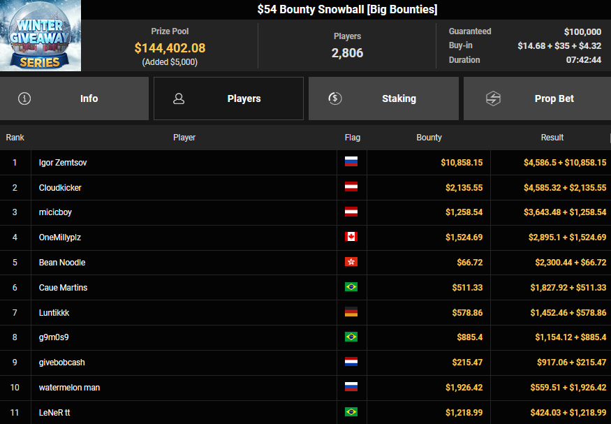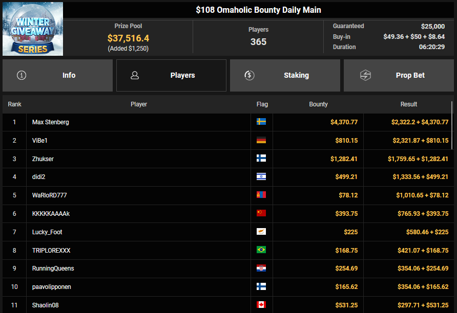Lokomothilo sicherte sich den Sieg beim $15 Winter Wonderbox ($13.776 + $317), ViBe1 wurde beim $108 Omaholic Bounty Daily Main Runner-up für $2.321 + $810. Cloudkicker wurde beim $54 Bounty Snowball Runner-up für $4.585 + $1.185, micicboy kassierte für Rang 3 noch $3.643 + $1.258.
