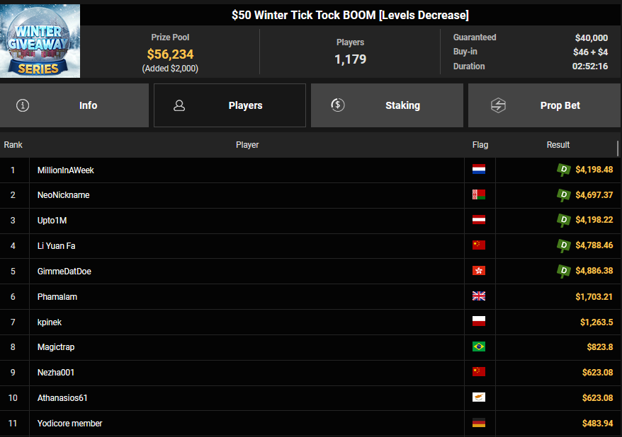 Mattinho landete beim $66 Snowy Super Six auf Rang 3 ($3.169 + $1.159), bistdudeppat hatte das Podest verpasst ($2.402 + $428). Upto1M war beim Deal beim $50 Winter tick Tock Boom dabei und kassierte $4.198 für Rang 3.