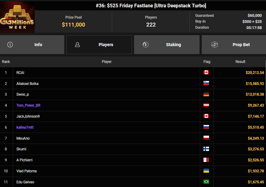 Bei den anderen Turnieren wurden gestern die Garantien wieder deutlich überschritten, nur die DACHs fehlten. Für das beste Ergebnis sorgte Swoo_p beim $525 Friday Fastlane, er kassierte $12.018 für Platz 3.