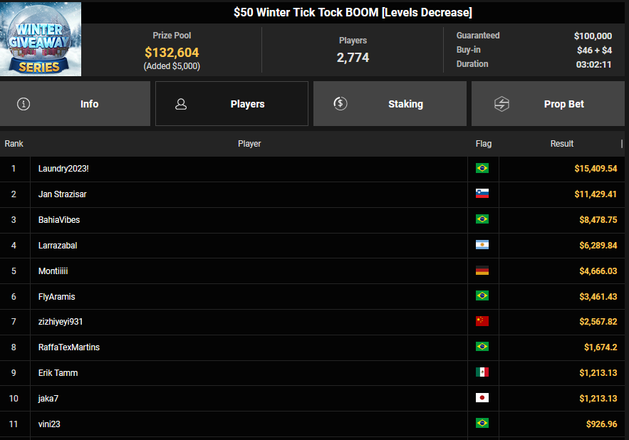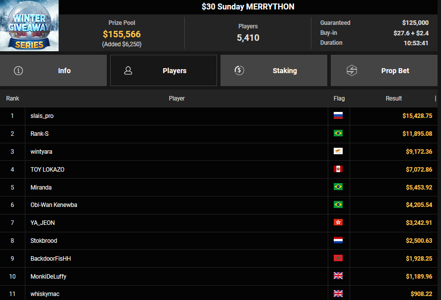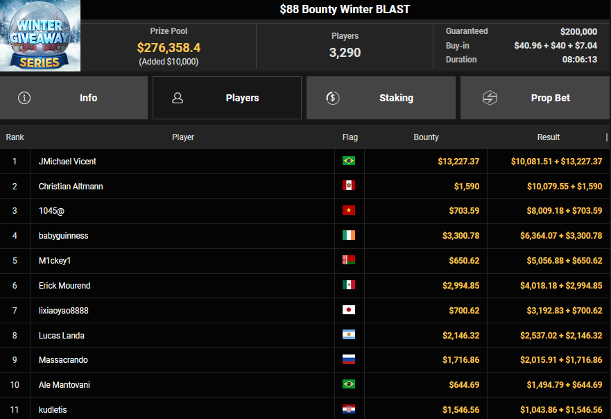 KaLdouN holte Rang 2 beim $108 Bounty Blastoff ($8.574 + $4.588), während sich Pascal Hartmann beim $77 Holiday Lucky Sevens durchsetzen konnte. Nach einem Deal kassierte er $47.595. Platz 3 ging an nodiar ($29.579).