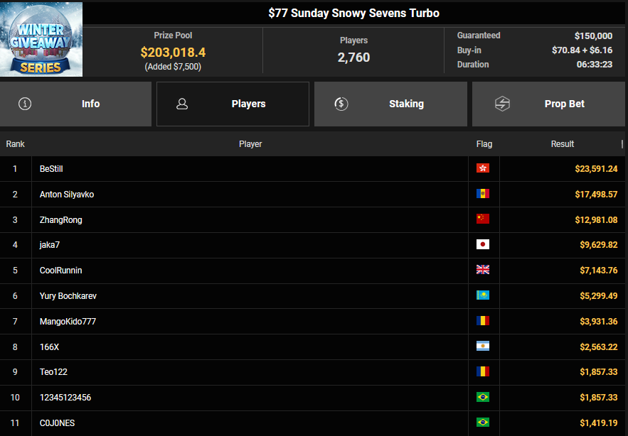 Allzu groß war die Ausbeute der DACHs am gestrigen Sonntag der $100 Mio. + $5 Mio. Added Winter Giveaway Series nicht, aber Pascal Hartmann trug sich n die Siegerlisten ein.
