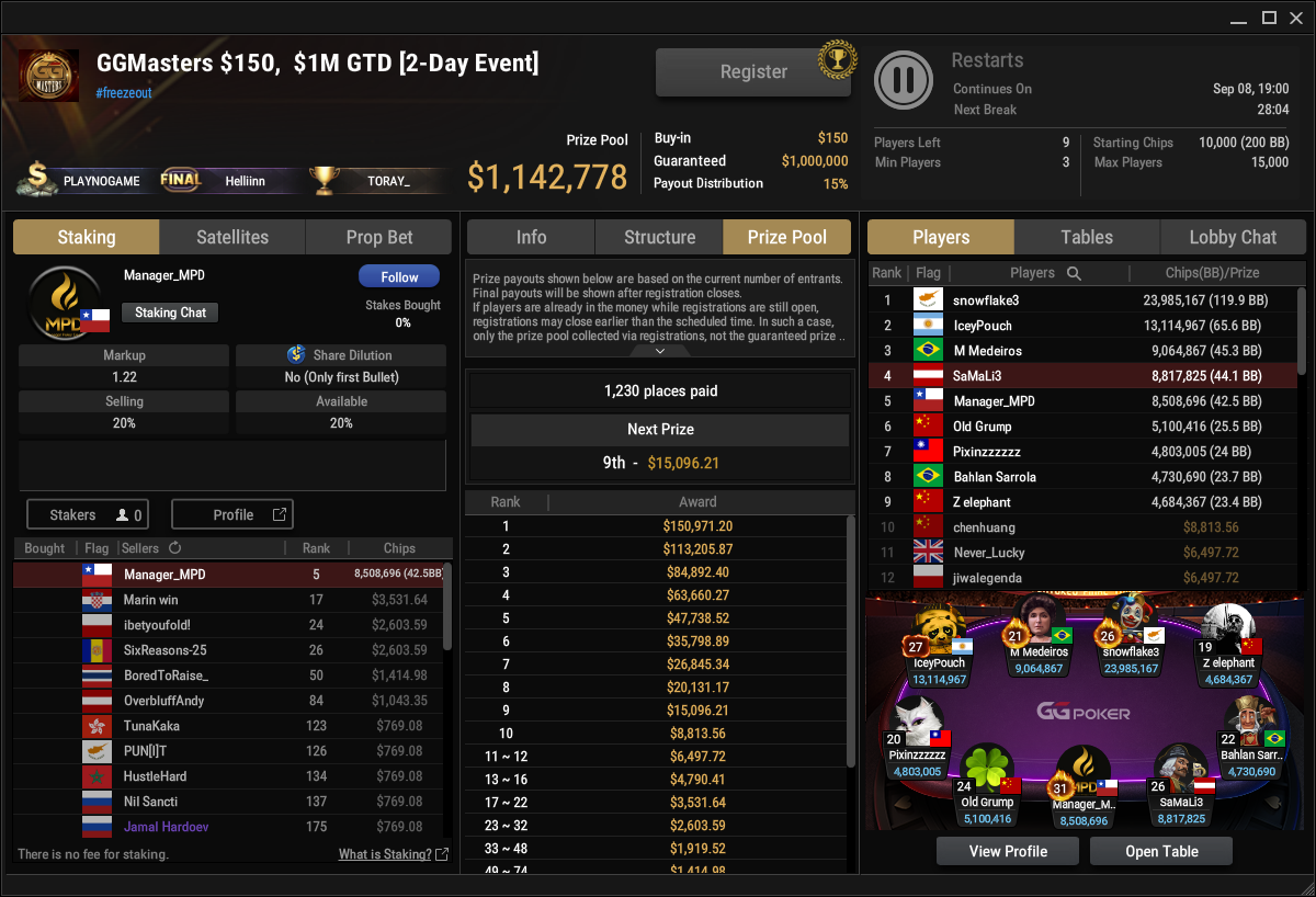 Beim $150 GGMasters knackte man mit 8.281 Teilnehmern die Millionengarantie, $1.142.778 landeten im Pot. Die letzten neun spielen heute noch um die Siegprämie von $150.971. SaMaLi3 ist der letzte Österreicher am Tisch.