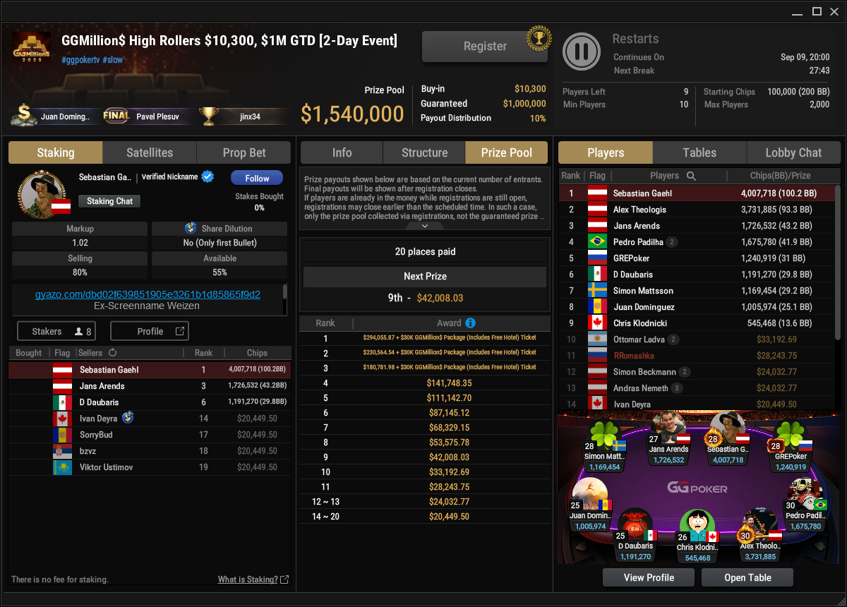 Neben der WSOP Online gibt es natürlich auch noch andere Action auf GGPoker. So führt Sebastian Gähl das Finale beim $10k GGMillion$ an, auch bei den $150 GGMasters hat SaMaLi3 noch Chancen auf den Sieg.