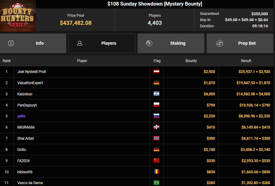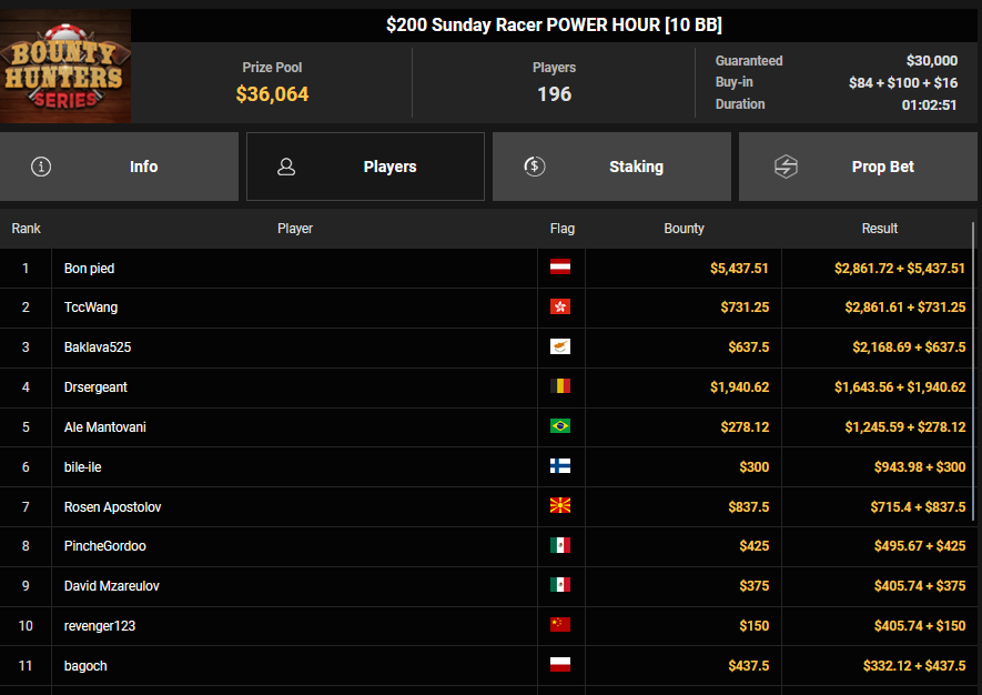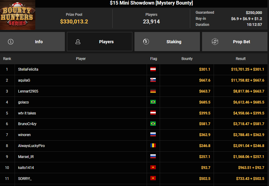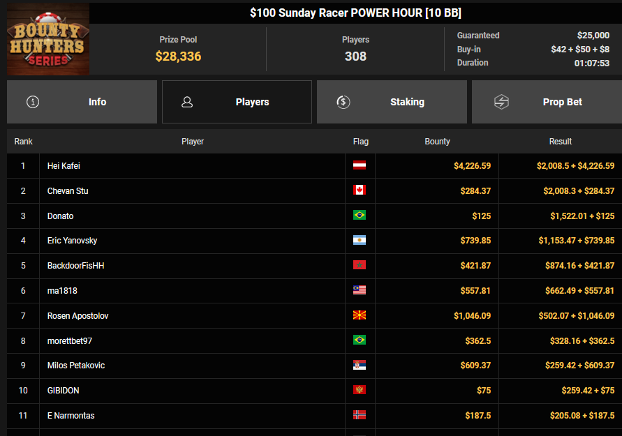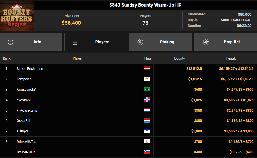 Schon am Sonntag gab es einige Erfolge zu feiern. So holte StellaFelicita das $15 Mini Showdown für $15.701 + $301, Lennart2905 kassierte noch $8.817 + $663 für Rang 3. ValuationExpert wurde Runner-up beim $108 Sunday Showdown für $19.447 +$1.870. Simon Beckmann holte das $840 Bounty Warm-up HR für $6.159 + $12.512. Hei Kafei konnte sich das $100 Power Hour für $2.008 + $4.226 sichern, Bon Pied war beim $200 Üower Hour für $2.861 + $5.437 erfolgreich.