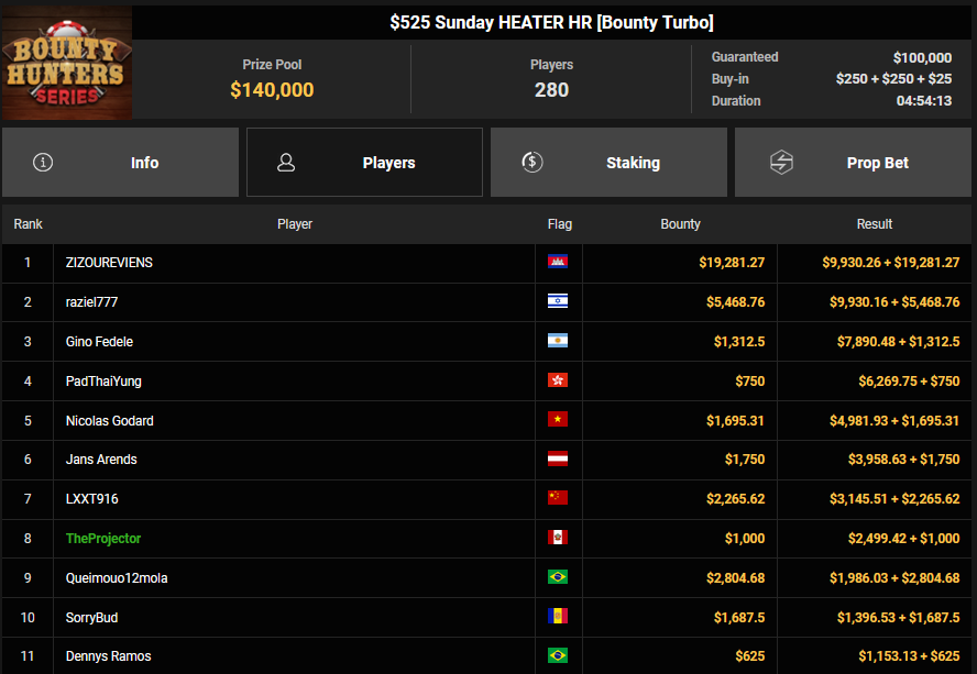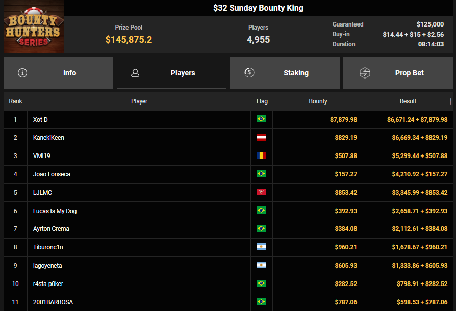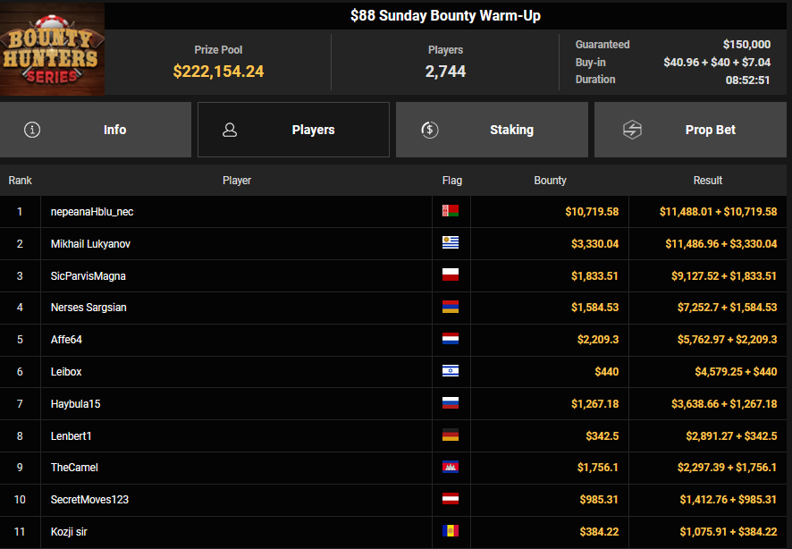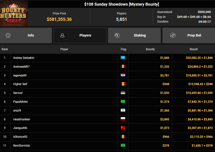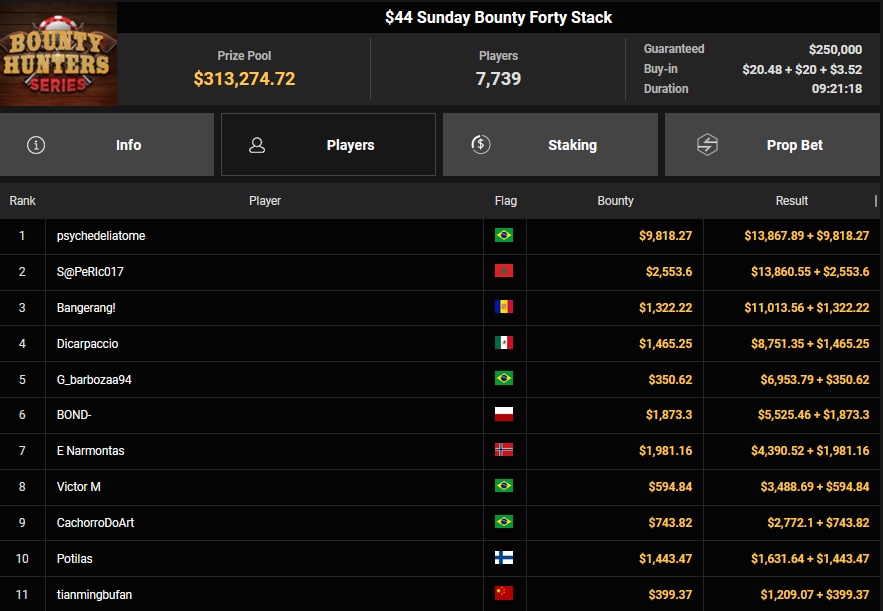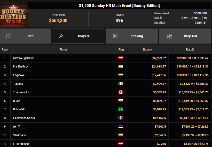 Max Neugebauer konnte sich das $1.500 Sunday HR den Sieg für $39.006 + $37.399 sichern, EagleAye wurd Dritter für $30.994 + 417.417. KanekiKeen konnte Rang 2 beim $32 Sunday Bounty King für $6.669 + $829 erobern. Darkdemon666 holte das $25 Bounty Overload für $523 + $13.585. Casper Engelien scheiterte beim $1.050 Monday Monster Stack HR erst im Heads-up und nahm $15.521 + 43.062 mit. milka29 konnte sich beim $32 Bounty King sichern, C Soulier schlug beim $250 Bounty Freezeout für $5.883 + $6.946 zu.