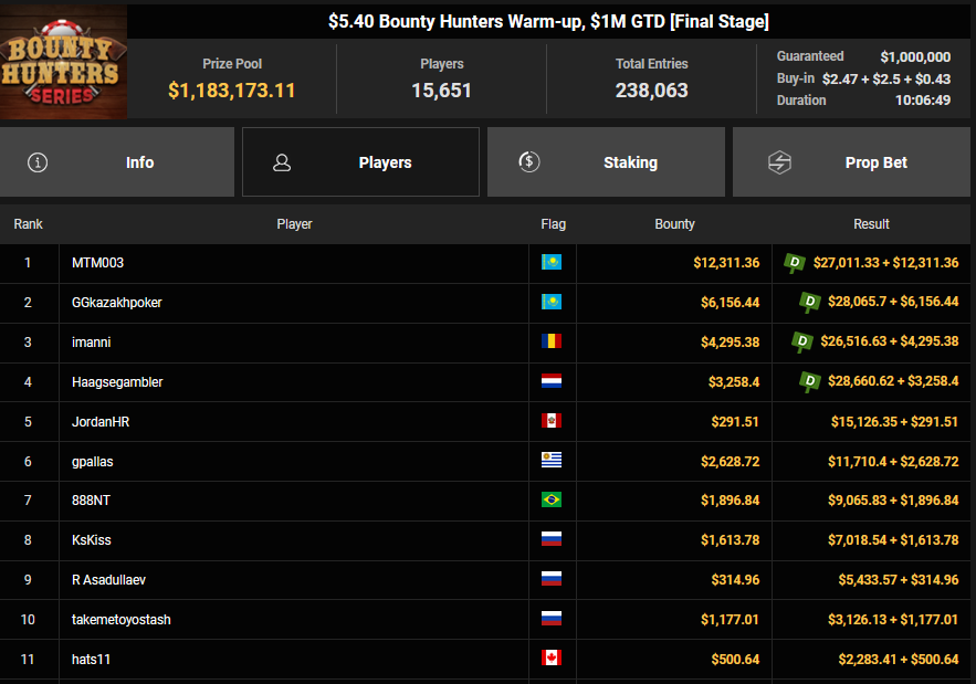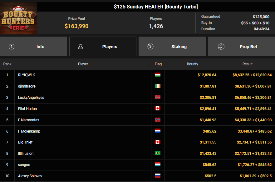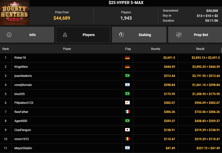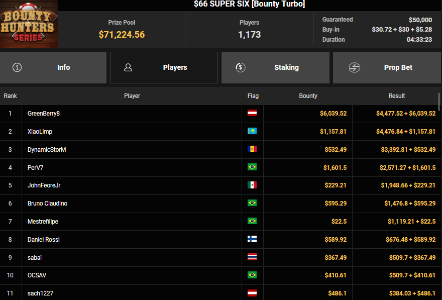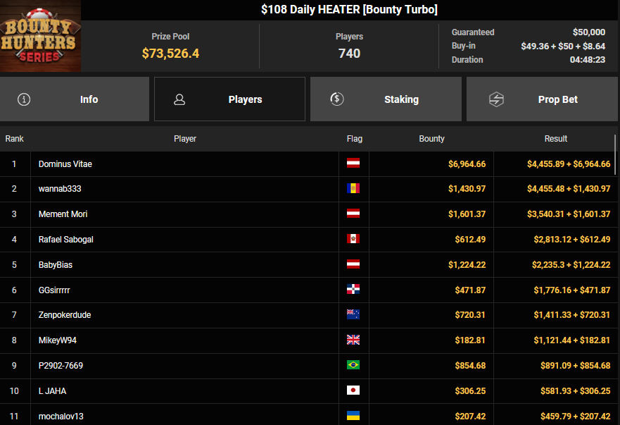 Dominus Vitae holte das $108 Daily Heater für $4.455 + $6.964, Mement Mori kassierte für Rang 3 noch $3.540 + $1.601. GreenBerry8 war beim $66 Super Six erfolgreich ($4.477 + $6.039), während Risker18 (1/$2.893 + $2.691) und KingAilton (2/$2.892 + $444) den Doppelsieg beim $25 Hyper 5-max feiern konnten.