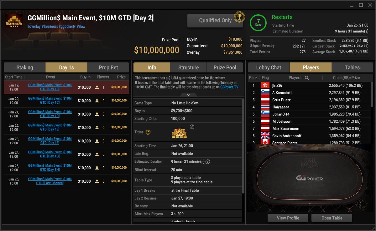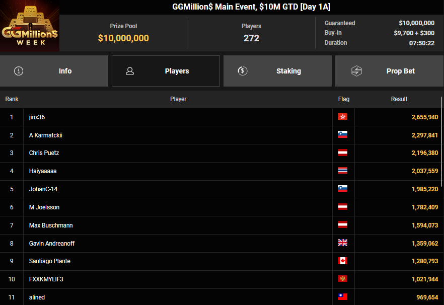 Das $10.300 GGMillion$ Main Event kommt mit neun Flights und $10.000.000 GTD. Gestern ging es in den ersten Heat, der 273 Entries (202/71) anlockte. 27 Spieler qualifizierten sch für Tag 2 am 26. Januar, wobei sich Chris Pütz Rang 3 sichern konnte, auch Max Buschmann ist gut aufgestellt.