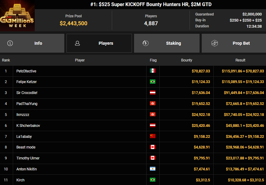 Beim $525 Super Kickoff Bounty Hunters HR waren $2.000.000 garantiert, mit 4.887 Entries kam man aber auch hier locker über die Garantie. Sir Crocodile! belegte als bester Österreicher Rang 3 für $91.449 + $17.636.