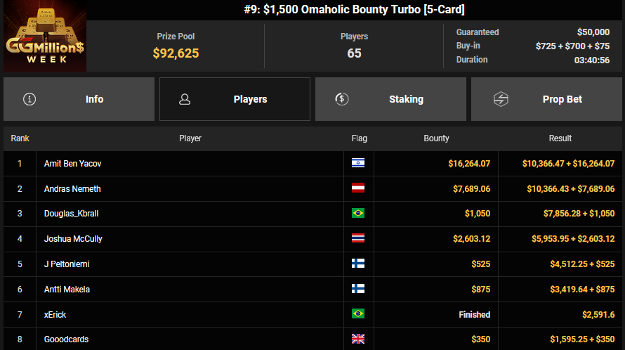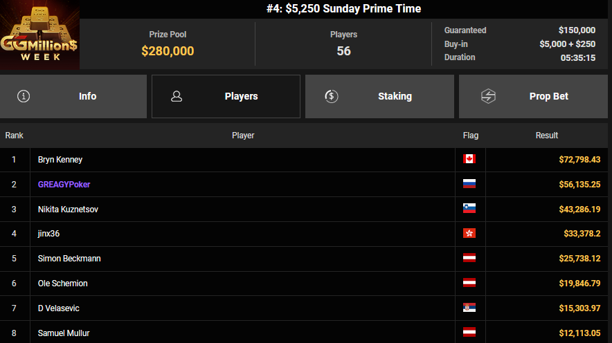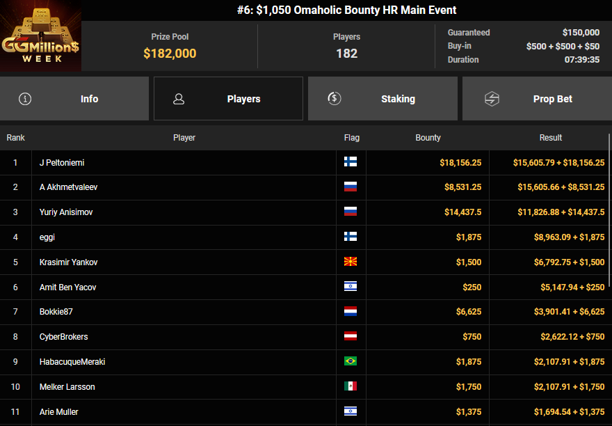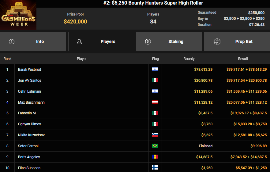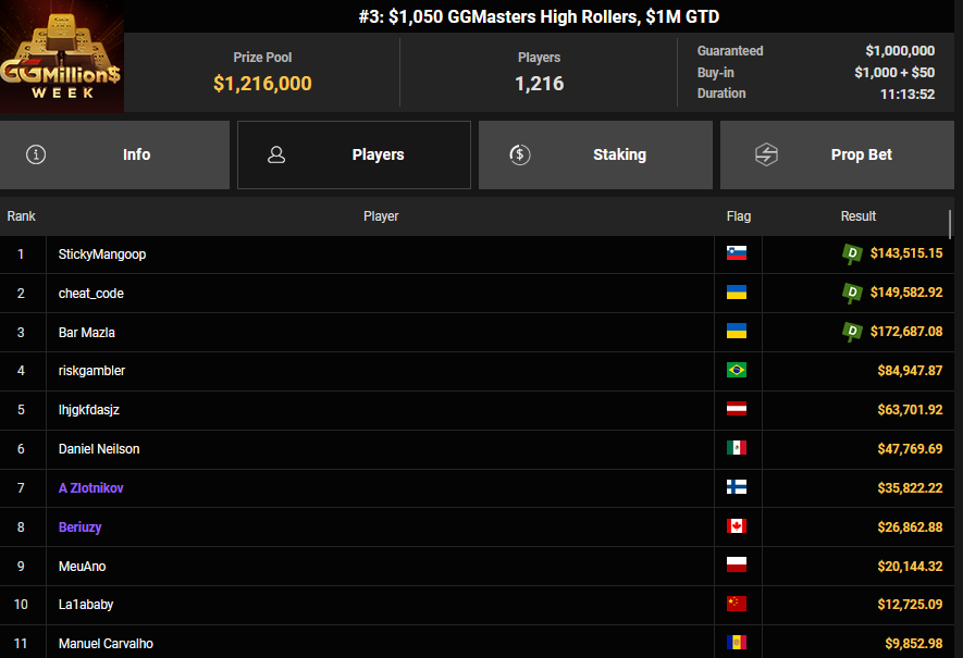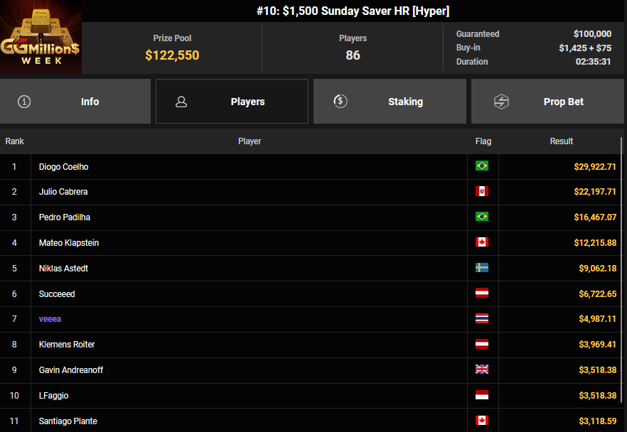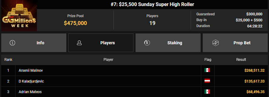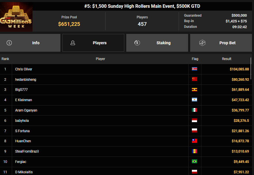 Max Buschmann schrammte beim $5.250 Bounty Hunters HR am Podest vorbei (4/$25.077 + $11.328), auch for lhjgkfdasjz gab es beim $1.050 GGMasters HR für Rang 5 einen satten Zahltag von $63.701. Das teuerste Turnier gestern war das $25.500 Sunday Super High Roller, das 19 Runner hatte. Arsenii Malinov holte den Sieg für $268.511.