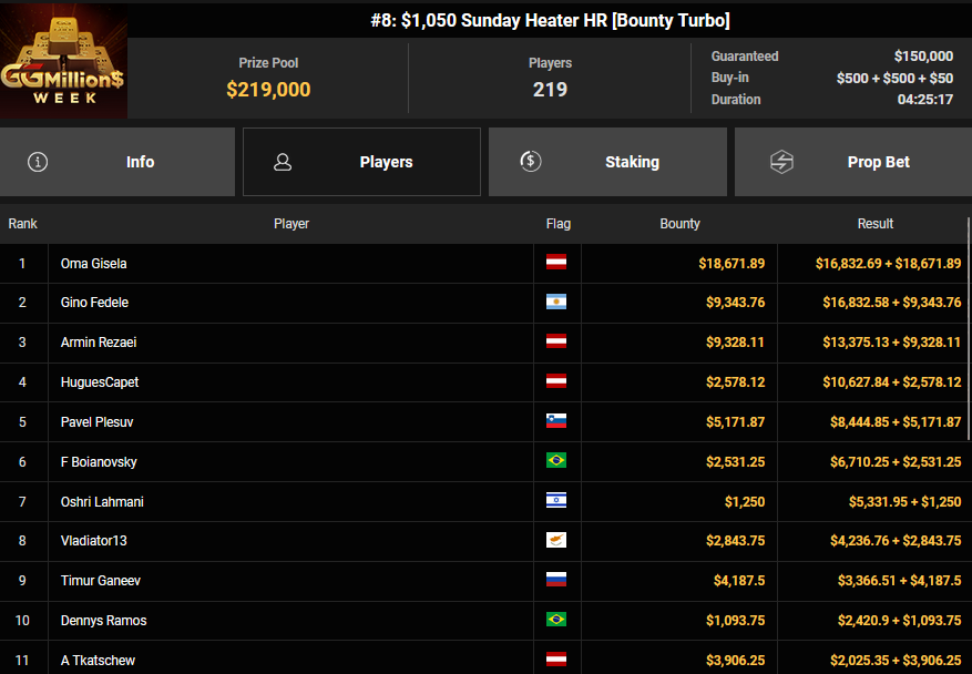 Für den einzigen österreichischen Sieg sorgte Oma Gisela beim $1.050 Sunday Heater HR ($16.832 + $18.671), Armin Rezaei wurde Runner-up für $13.375 + $9.328.