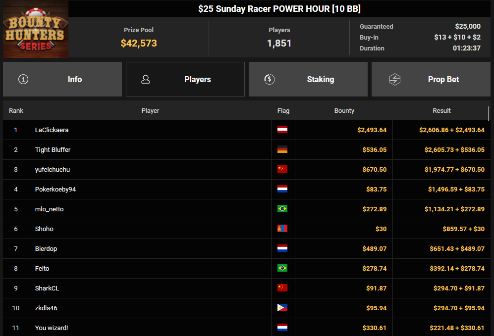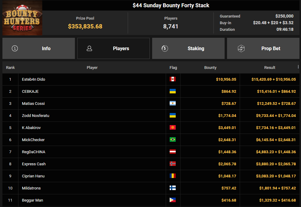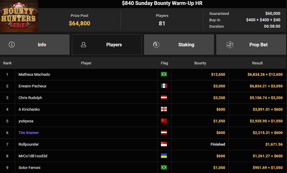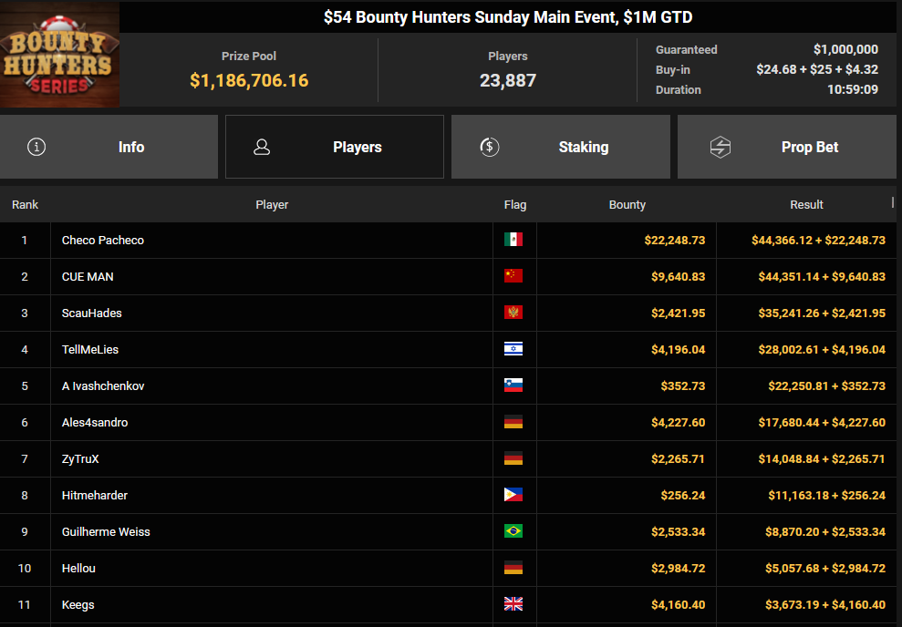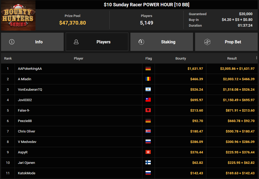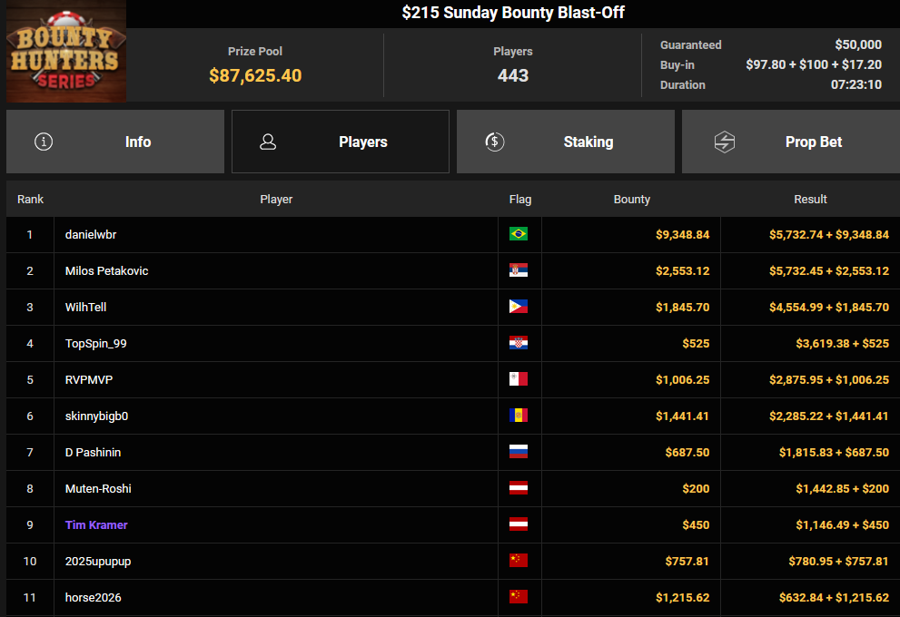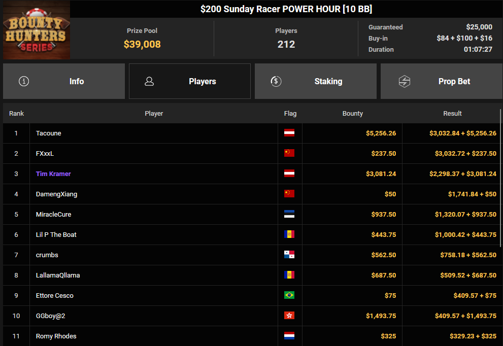 Tacoune siegte beim $200 Power Hour für $3.032 + $5.256, Tim Kramer wurde Dritter für $2.298 + $3.081. Das $54 Bounty Hunters Sunday Main Event lockte dieses Mal gleich 23.887 Entries an, Ales4sandro kam auf Rang 6 für $17.680 + $4.227, ZyTruX kassierte für Rang 7 $14.048 + $2.265. Max Buschmann verpasste den Sieg beim $525 Bounty Hunters HR und konnte $84.700 + $13.868 kassieren.