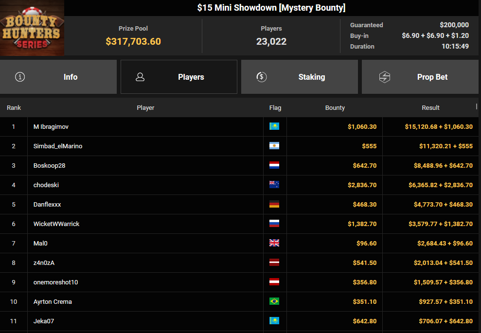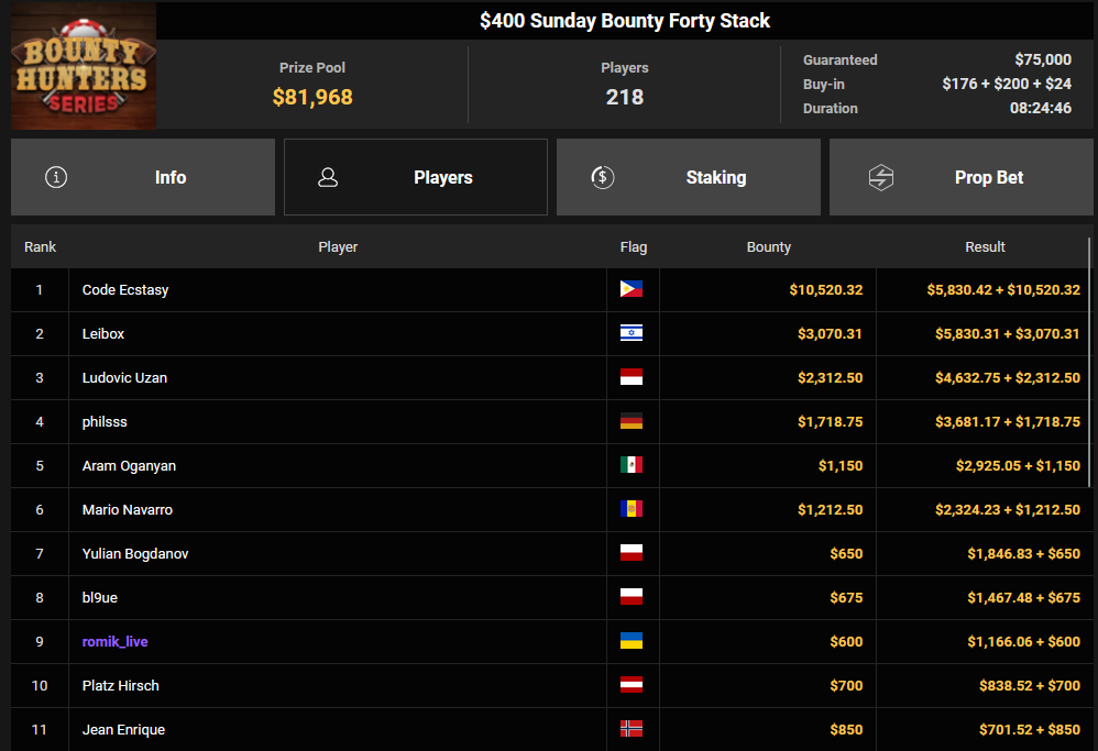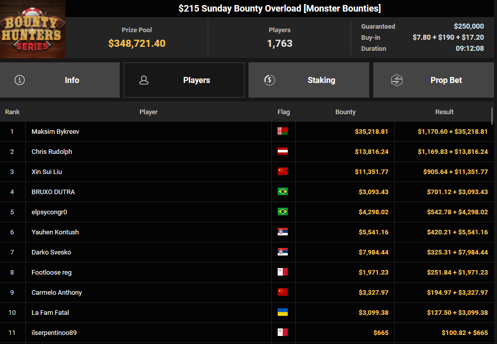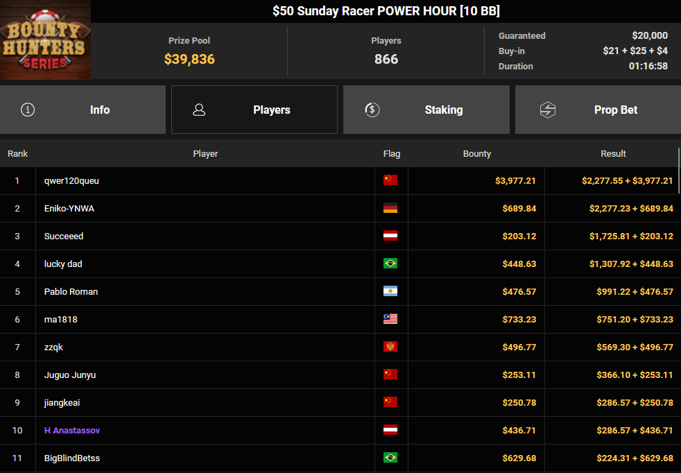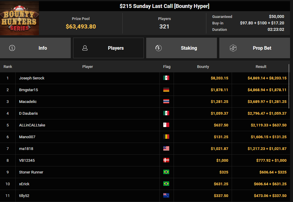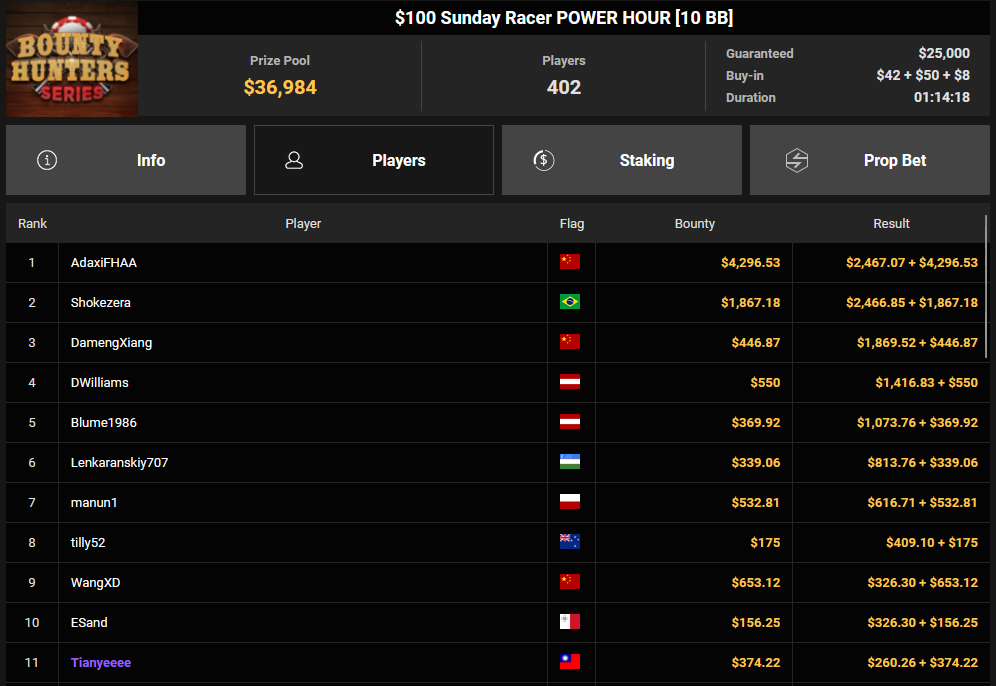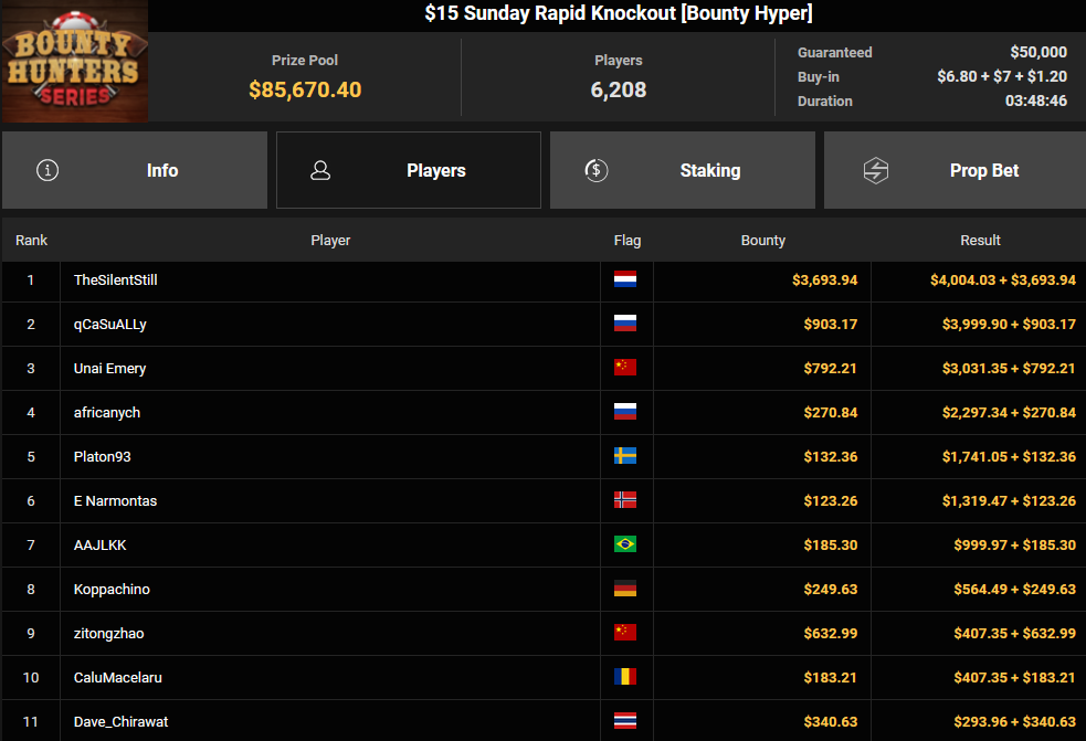 Tacoune siegte beim $200 Power Hour für $3.032 + $5.256, Tim Kramer wurde Dritter für $2.298 + $3.081. Das $54 Bounty Hunters Sunday Main Event lockte dieses Mal gleich 23.887 Entries an, Ales4sandro kam auf Rang 6 für $17.680 + $4.227, ZyTruX kassierte für Rang 7 $14.048 + $2.265. Max Buschmann verpasste den Sieg beim $525 Bounty Hunters HR und konnte $84.700 + $13.868 kassieren.