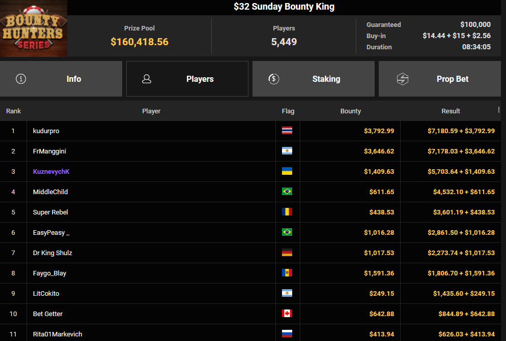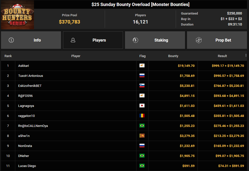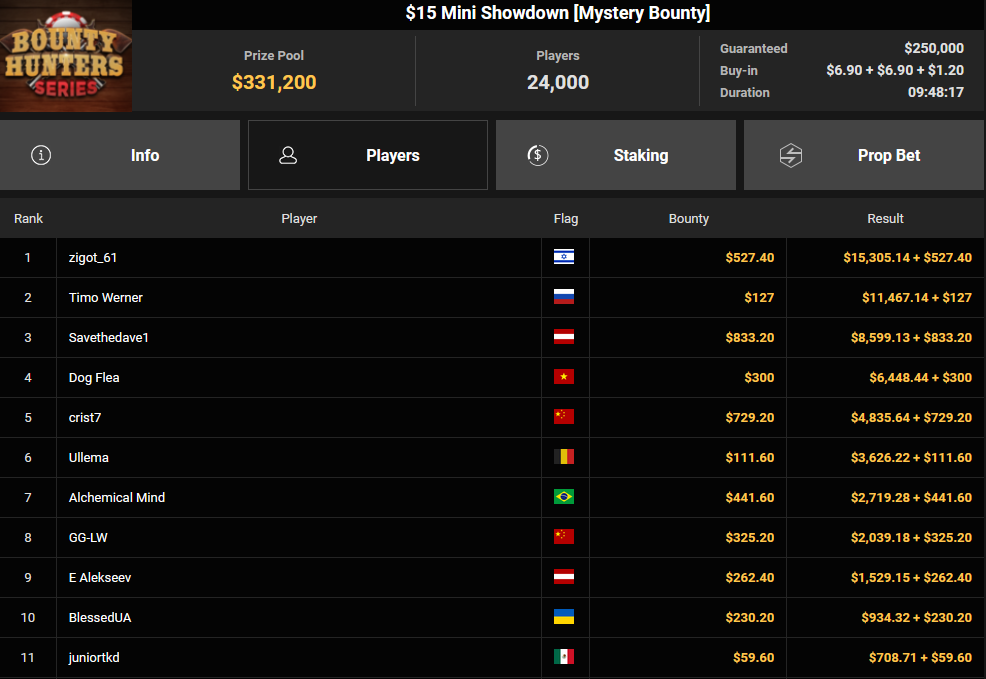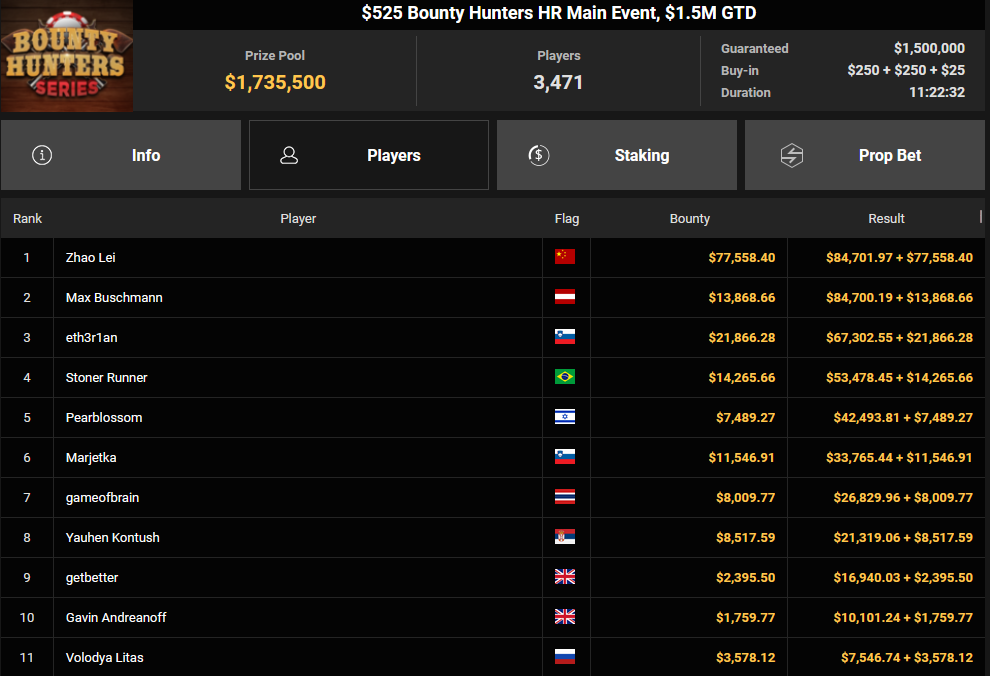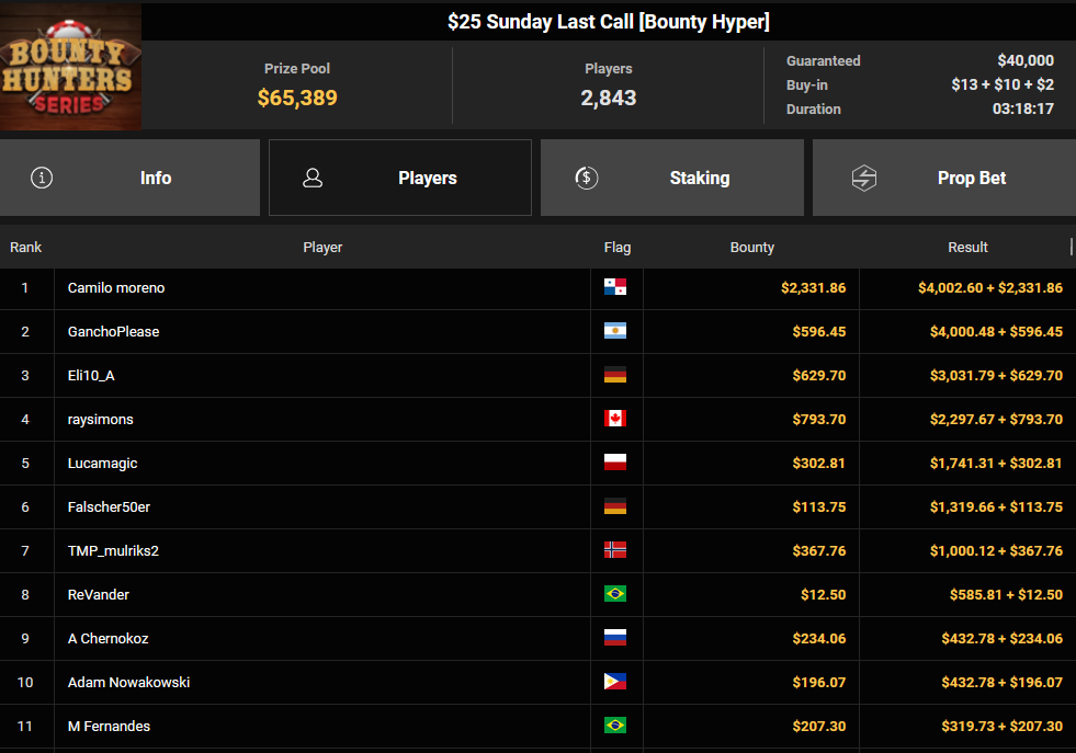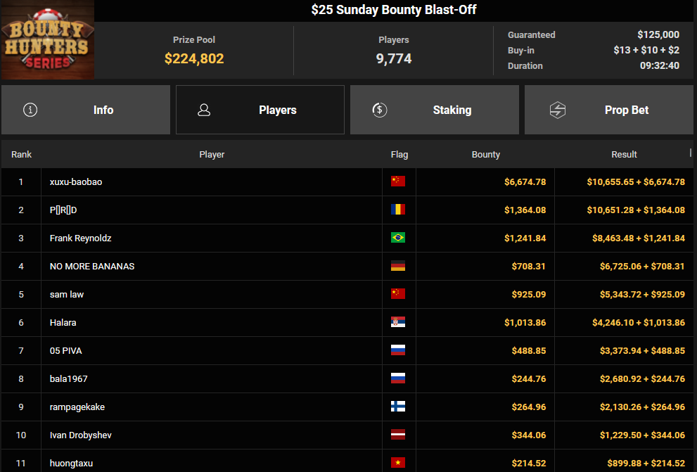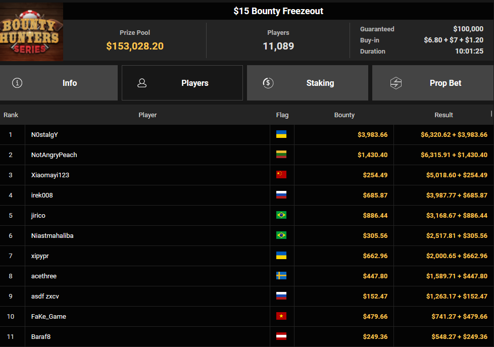 Tacoune siegte beim $200 Power Hour für $3.032 + $5.256, Tim Kramer wurde Dritter für $2.298 + $3.081. Das $54 Bounty Hunters Sunday Main Event lockte dieses Mal gleich 23.887 Entries an, Ales4sandro kam auf Rang 6 für $17.680 + $4.227, ZyTruX kassierte für Rang 7 $14.048 + $2.265. Max Buschmann verpasste den Sieg beim $525 Bounty Hunters HR und konnte $84.700 + $13.868 kassieren.
