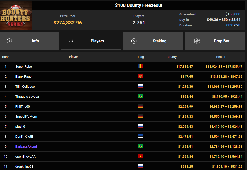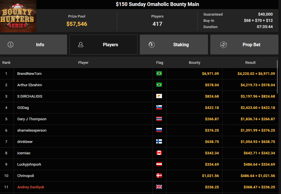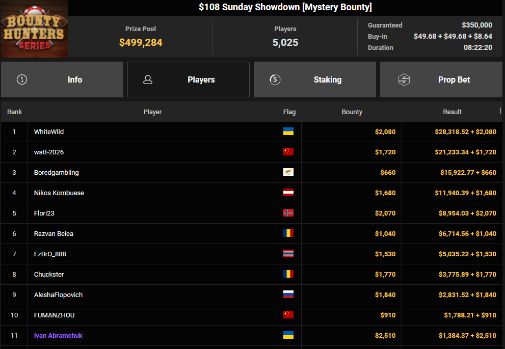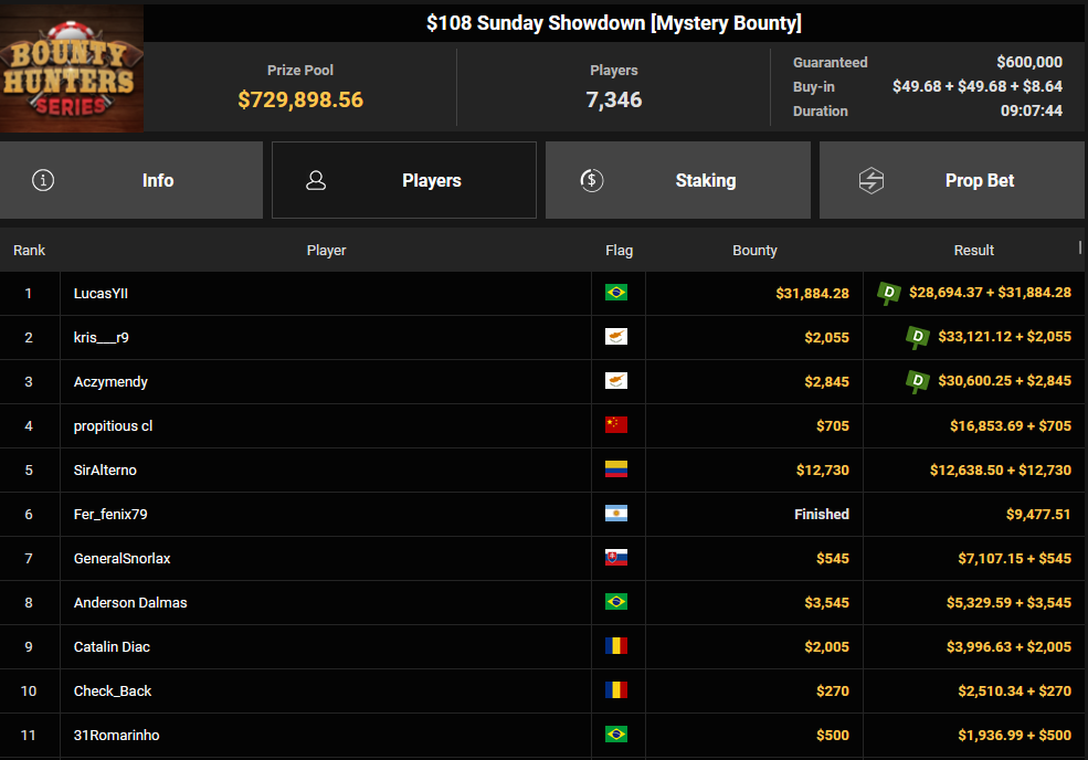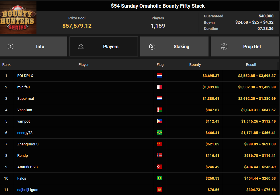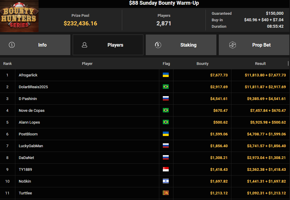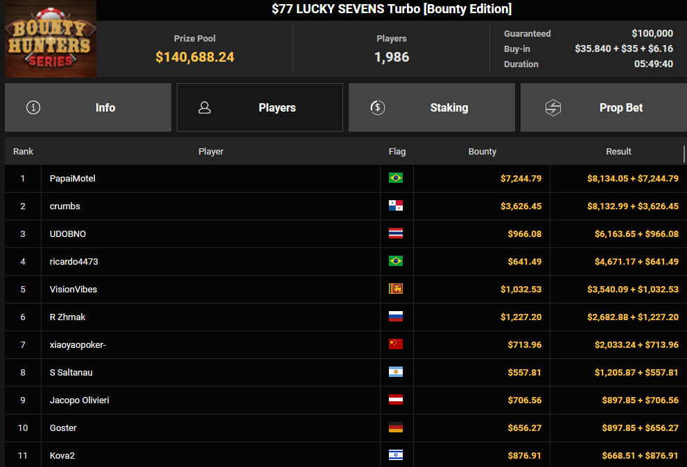 Tacoune siegte beim $200 Power Hour für $3.032 + $5.256, Tim Kramer wurde Dritter für $2.298 + $3.081. Das $54 Bounty Hunters Sunday Main Event lockte dieses Mal gleich 23.887 Entries an, Ales4sandro kam auf Rang 6 für $17.680 + $4.227, ZyTruX kassierte für Rang 7 $14.048 + $2.265. Max Buschmann verpasste den Sieg beim $525 Bounty Hunters HR und konnte $84.700 + $13.868 kassieren.