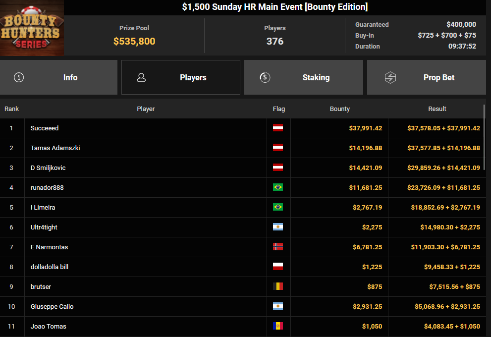 Eniko-YNWA kassierte beim $50 Power Hour für Rang 2 $2.277 + $689, während Succeeed hier für Platz 3 $1.725 + $203 mitnahm. Beim $1.500 Sunday HR Main Event siegte Succeeed, was ihm $37.578 + $37.991 bescherte. Daniel Smiljkovic kassierte für Rang 3 noch $29.859 + $14.421.