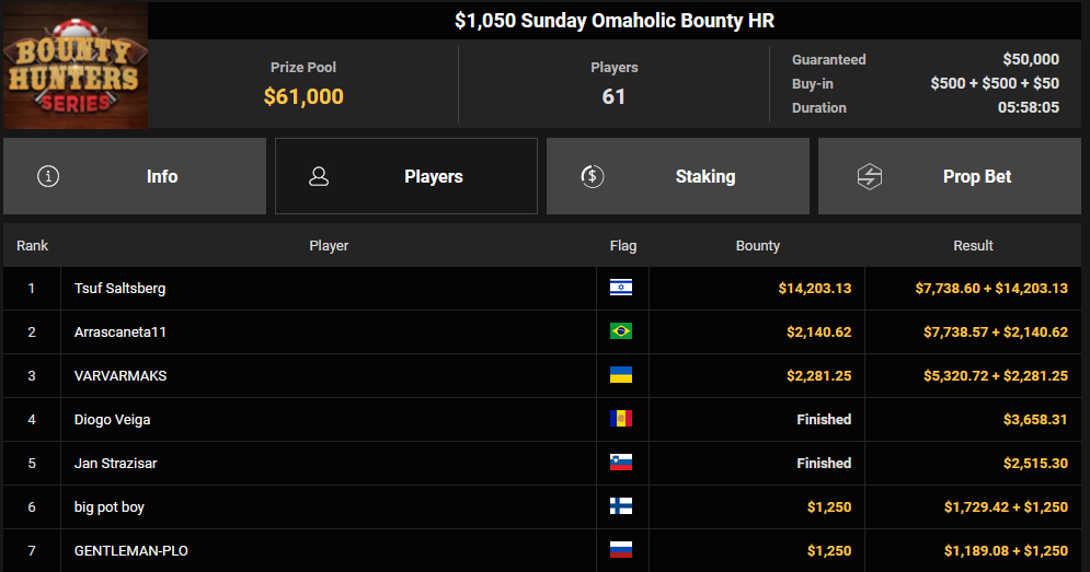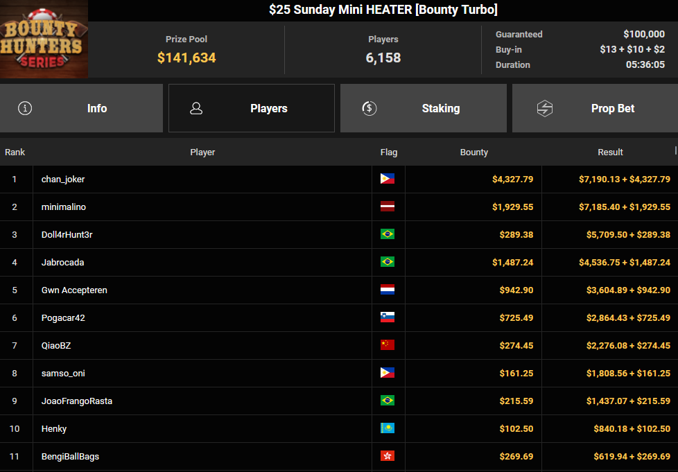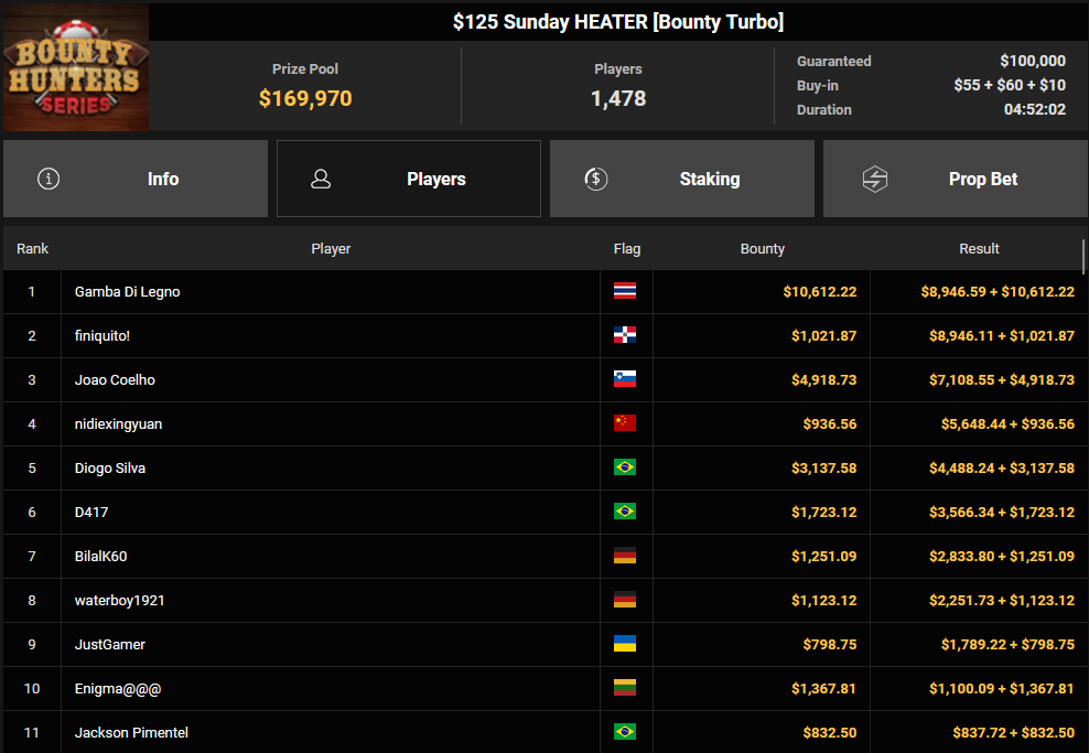 Puntoprazol verpasste den $525 Sunday Heater HR Sieg ($10.020+ $2.093), Eli10_A wurde Dritter beim $25 Last Call für $3.031 + $629. Bmgstar15 kassierte als Runner-up beim $215 Last Call noch $4.868 + $1.878.