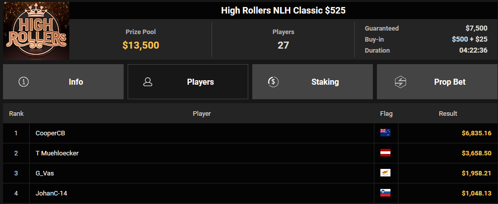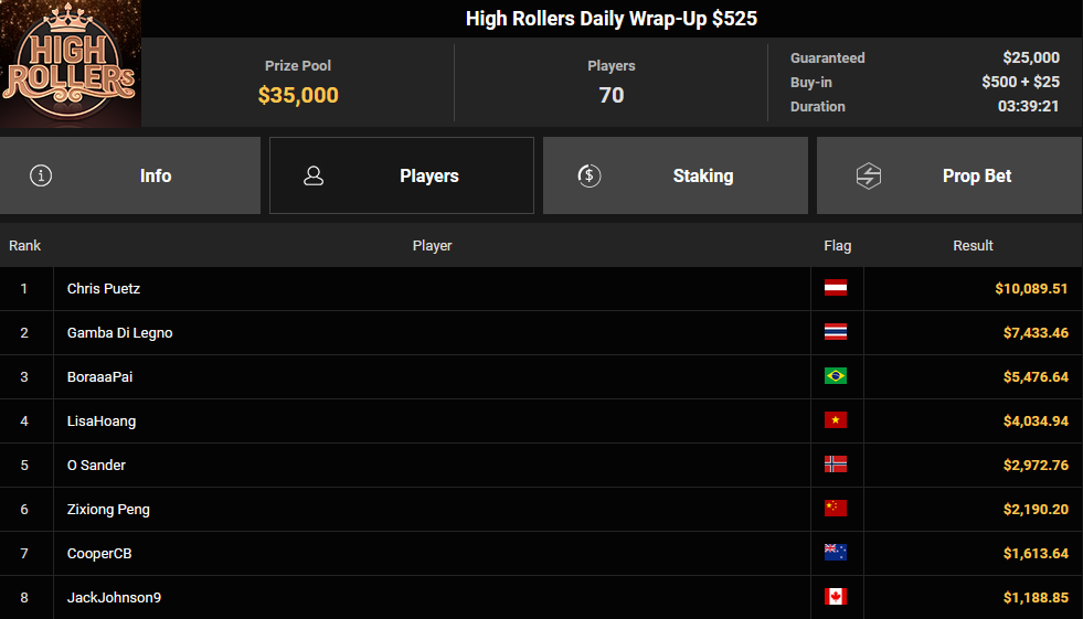 Im High Roller Club herrschte nur mäßige Action, Christopher Pütz konnte sich den Sieg beim $525 Daily Wrap-Up für $10.089 holen, Thomas Mühlöcker wurde beim $525 Classic Runner-up für $3.658.