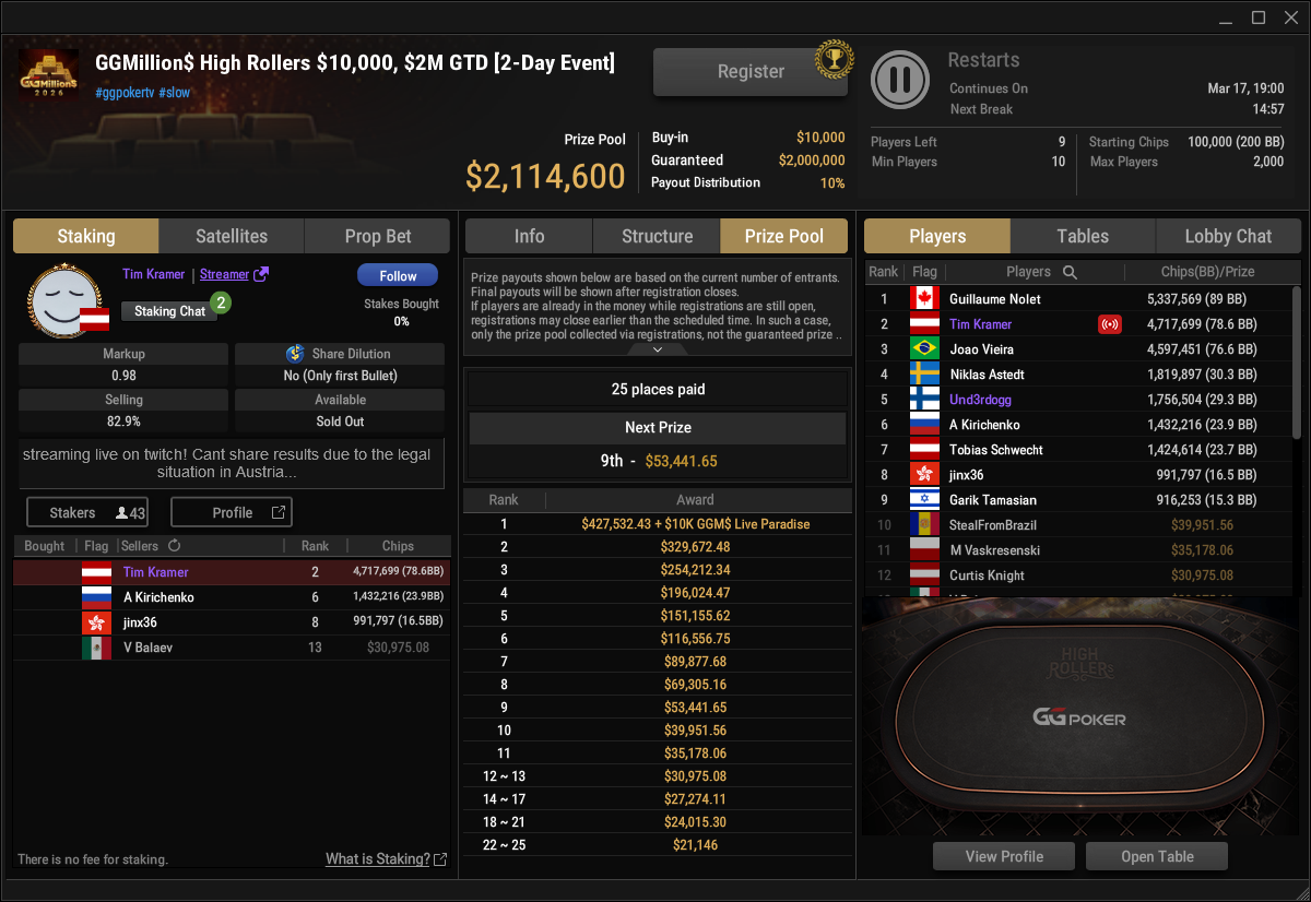 Diese Woche sind Tim Krämer und Tobias Schwecht am Final Table beim $10k GGMillion$ auf GGPoker. Auch weitere Erfolge konnten verbucht werden.