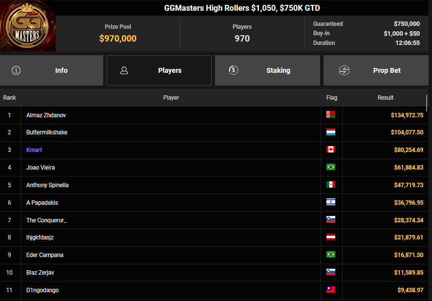 Beim $1.050 GGMaster High Rollers war es der Niederländer Buttermilkshake, der runner-up für $104.077 wurde. Tim Krämer kam beim $320 GGMasters Bounty an den Final Table und kassierte $13.674 + $2.348 für Rang 5, Diego Zeiter nahm für Rang 6 noch $10.865 + $1.457 mit.