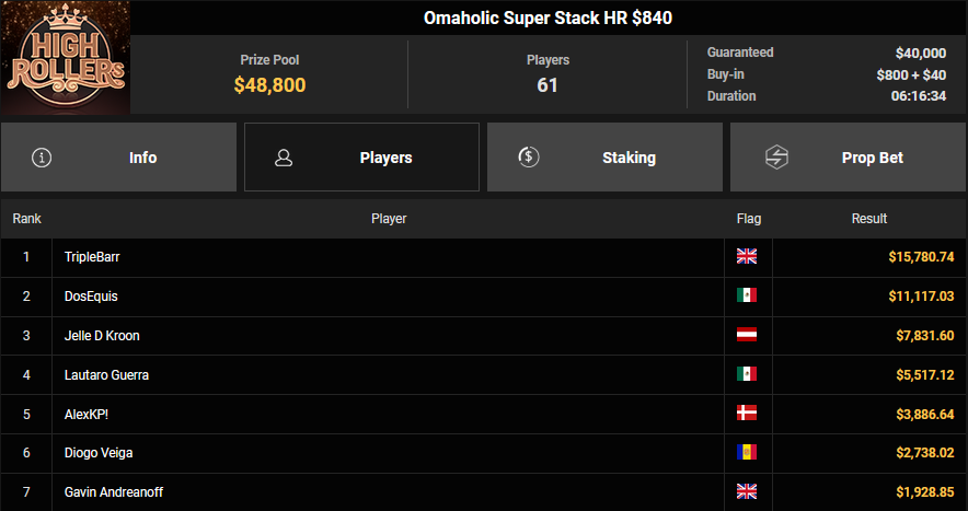 Auch diese Woche kam man mit 218 Entries wieder locker über die $2.000.0000 Garantie. Die top 25 Plätze waren bezahlt, Alex Tkatschew kassierte für Rang 23 $21.146, der Runner-up der Vorwoche, Linus Löliger, musste sich dieses Mal mit Rang 21 für $24.015 verabschieden. Tobias Schwecht startet von Rang 7 aus ins Finale, Tim Krämer liegt aussichtsreich auf Rang 2 hinter Guillaume Nolet. Auch der schwedische Seriensieger Niklas Astedt ist wieder mit dabei. Alle haben $53.441 sicher, der Sieger kassiert $427.532 + $10k GGMillion$ Live Package.