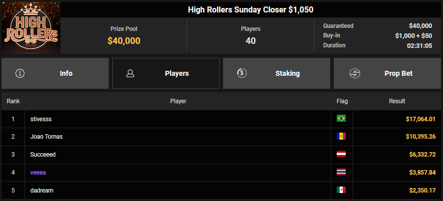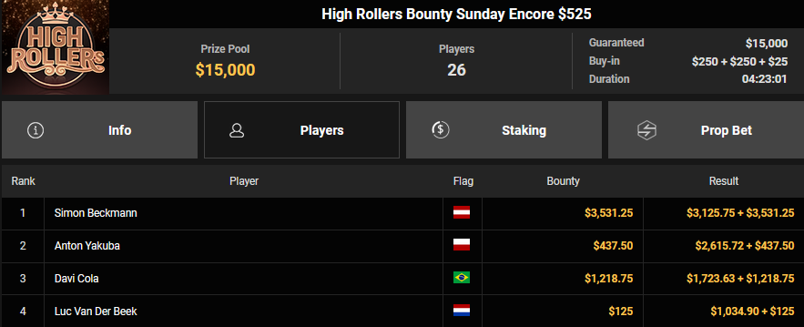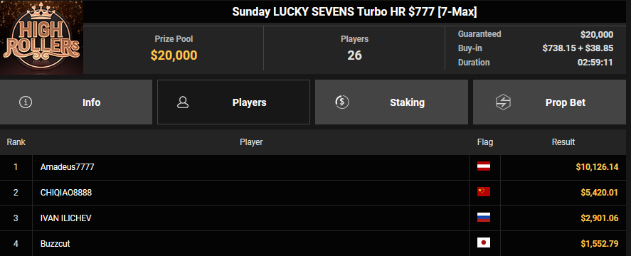 Amadeus7777 siegte beim $777 Lucky Sevens für $10.126, Simon Beckmann war beim $525 Sunday Encore für $3.125 + $3.531 erfolgreich. Succeeed konnte noch für Rang 3 beim $1.050 Closer $6.332 mitnehmen.