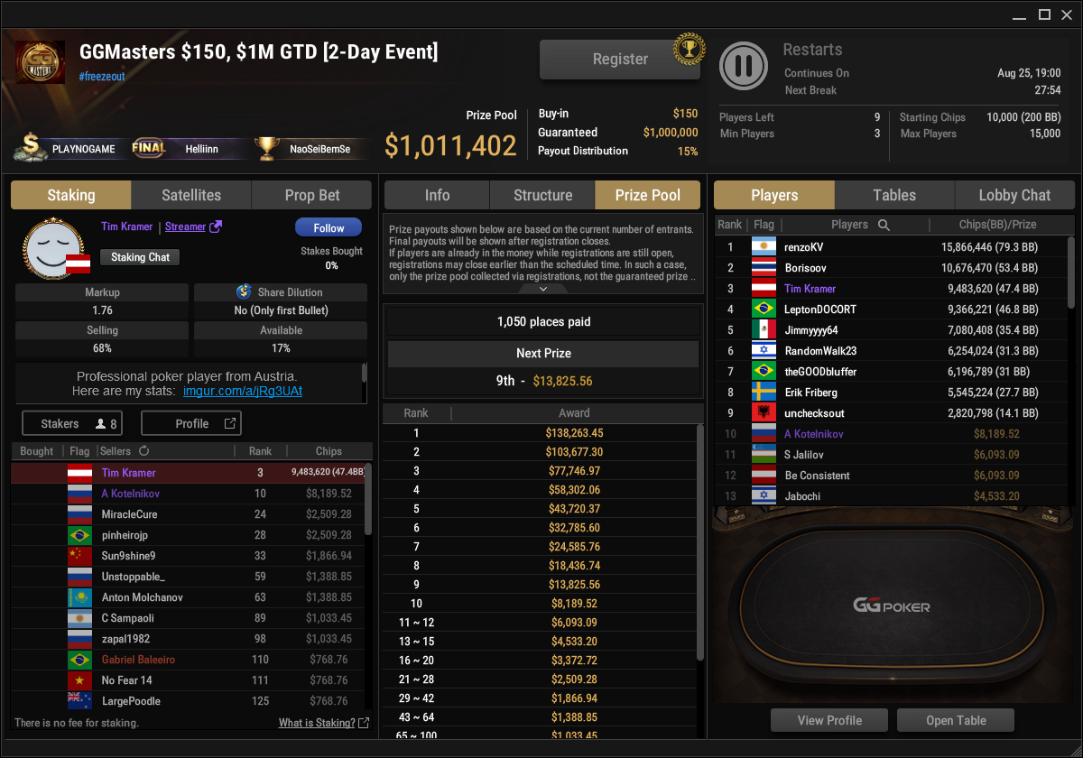Auch bei den $150 GGMAsters gibt es deutschsprachige Beteiligung am Final Table. Mit 7.329 Startern kam man diese Woche wieder über die Millionengarantie, $1.011.402 landeten im Pot. Die letzten neun spielen heute im Finale um die Siegprämie von $138.263. Twitch-Streamer Tim Kramer startet von Rang 3 aus ins Finale und hat auch bereits $13.825 Preisgeld sicher.