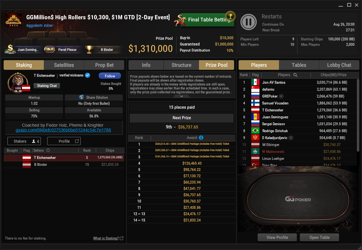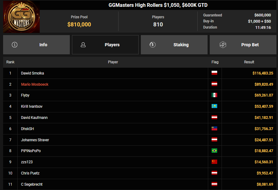 Bei den beiden anderen GGMasters Turnieren gab es verpasste Siege für die DACHs. Beim $1.050 GGMasters High Roller waren es diese Woche 810 Teilnehmer, Christopher Pütz verpasste den Final Table (10/$9.952), DhskSH kassierte $31.756 für Rang 6 und DAvid Kaufmann kam auf Rang 5 für $41.182. Mario Mosböck musste sich im Heads-up Dawid Smolka. Für Platz 2 gab es $89.820, der Sieg war $116.483 wert.