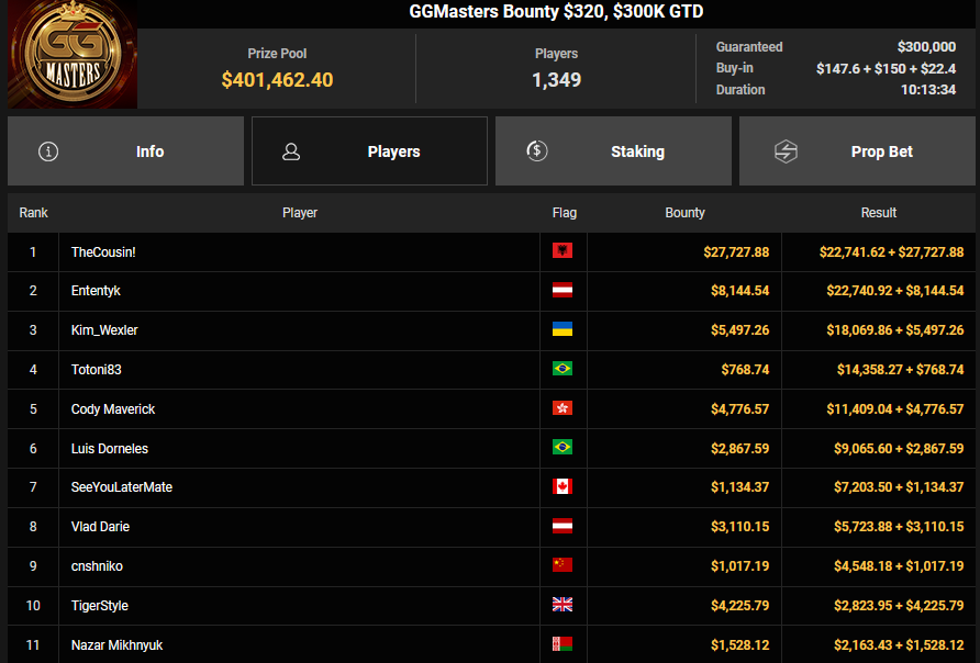 Beim $320 GGMasters Bounty sorgten 1.349 Starter für $401.462 im Pot, Ententyk kam ins Heads-up, musste sich aber mit Rang 2 für $22.740 + $8.144 begnügen.