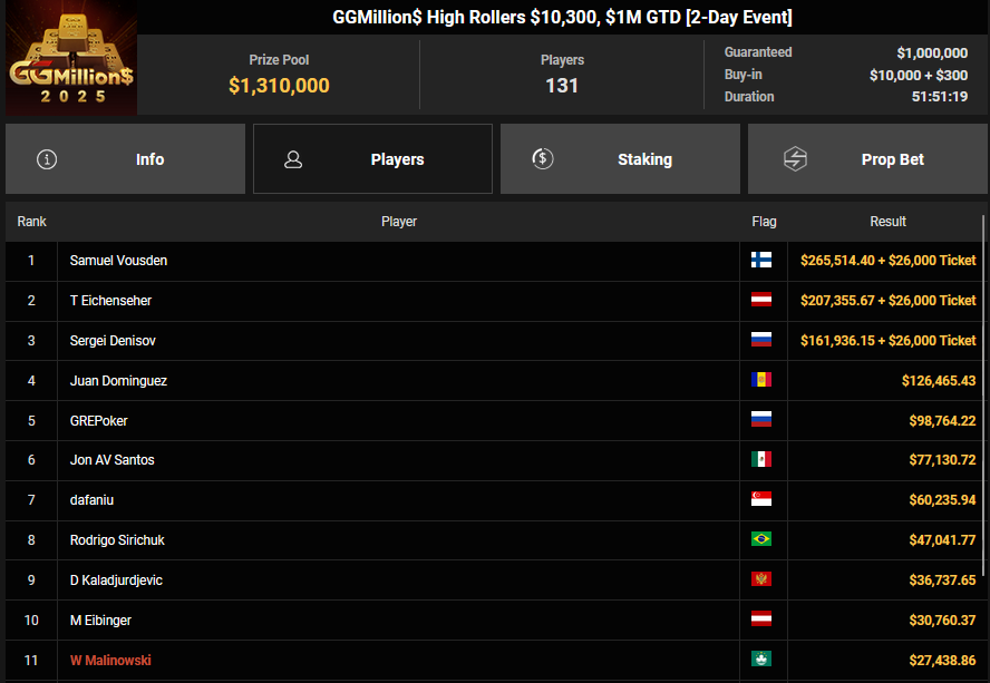 Fast hätte es den ersten Sieg beim $10k GGMillion$ auf GGPokerSieg für Tobias Eichenseher gegeben, letztlich wurde es aber Rang 2 für $207k + $30k GGMillion$ Package. Tim Kramer kam bei den $150 GGMasters auf Rang 5.