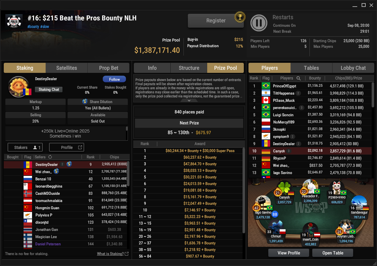 Hoffnungen auf das deutsche Bracelet gibt es auf jeden Fall beim $215 Beat the Pros (#16). Von den 7.013 Entries sind hier noch 126 Spieler übrig, aber Canyoh und RhyzmP sind sehr gut für das Finale heute aufgestellt. Der Sieger kann sich hier auf $60.244 + Bounties + $30k WSOPP Super Pass freuen.