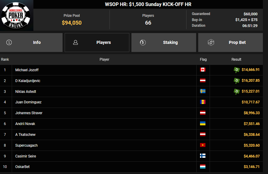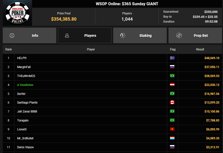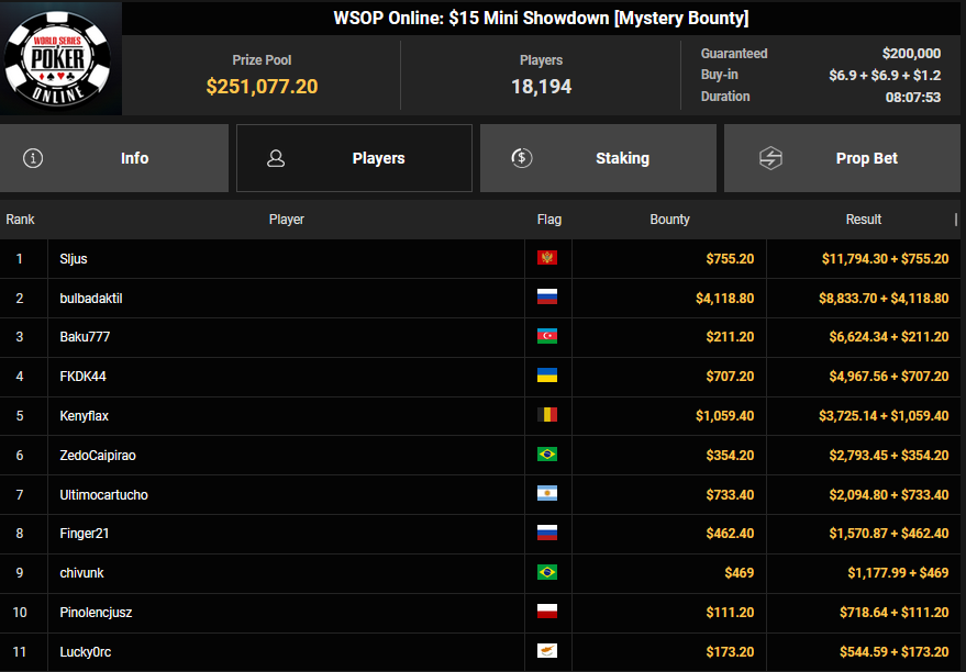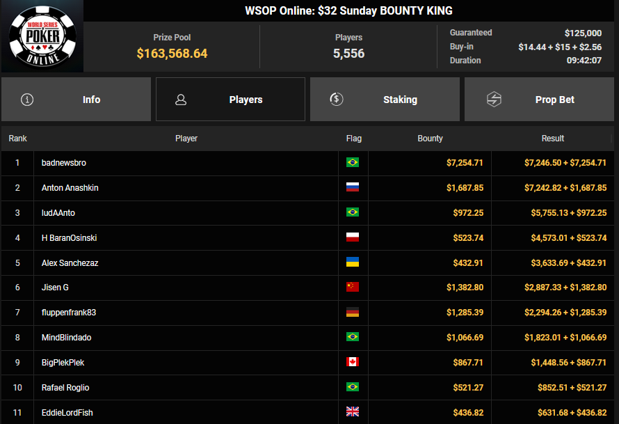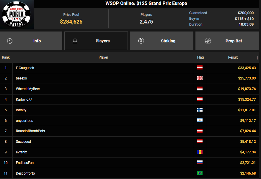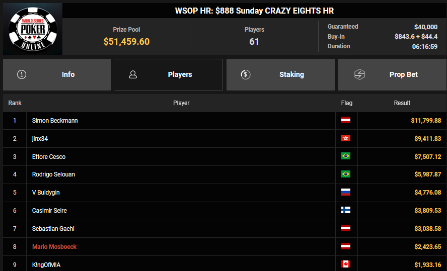 Florian Gaugusch schnappte sich das $125 Grand Prix Europe für $33.425, Karlovic77 kam auf Rang 4 für $15.324. wund3rwuz kassierte $16.563 + $2.728 für Platz 2 beim $44 Bounty Hunters Forty Stack. Simon Beckmann konnte sich beim $888 Crazy Eights HR den Sieg für $11.799 abholen, während Max Buschmann beim $525 Sunday Mystery Bounty HR am Podest vorbeischrammte und sich $51.822 + $12.740 für Platz 4 abholte.