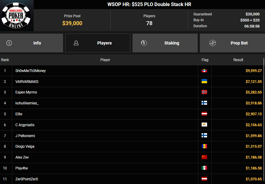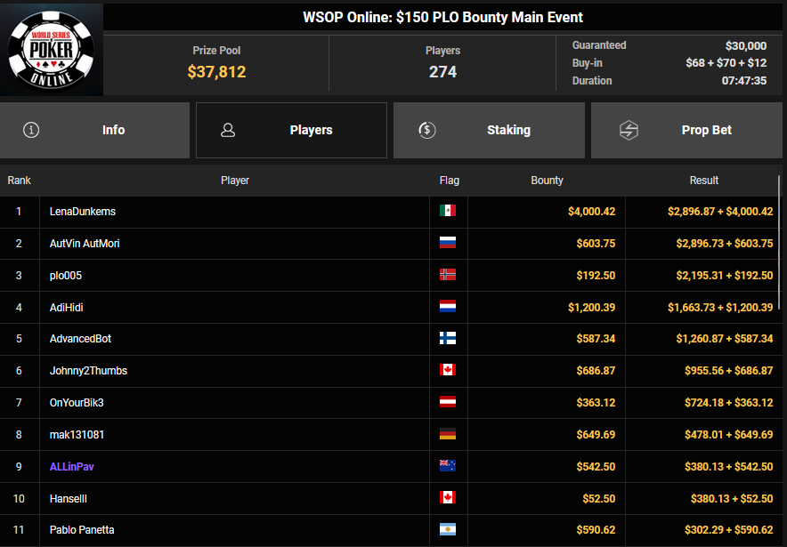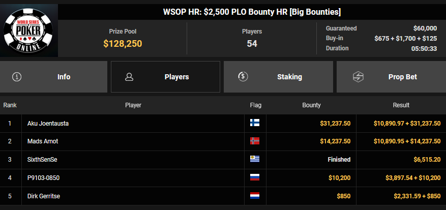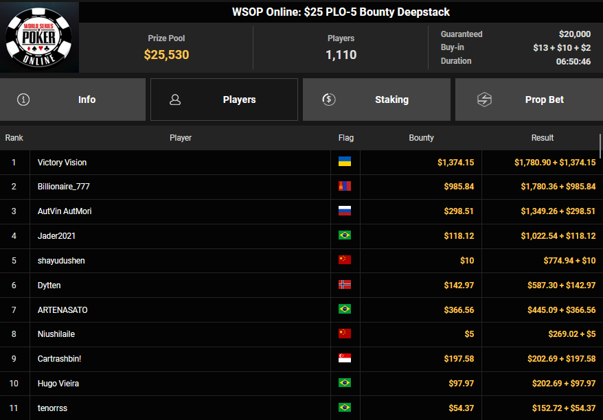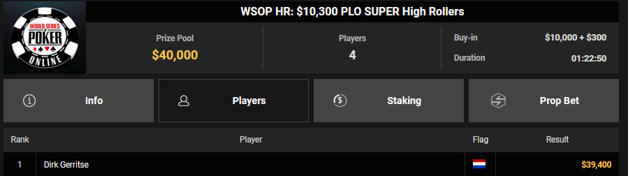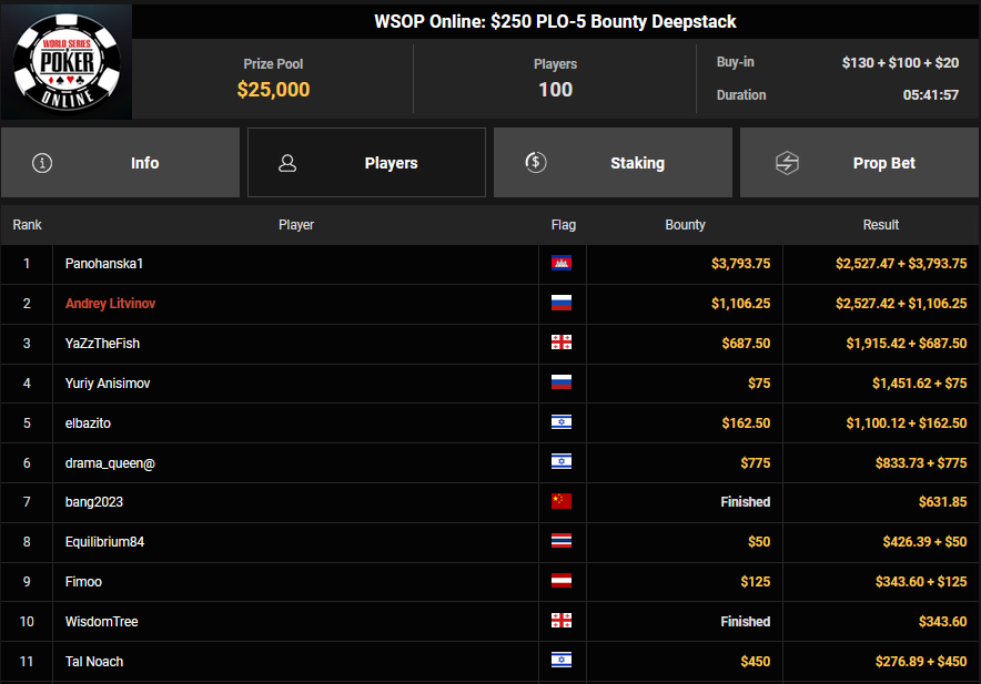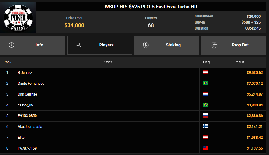 Ein weiteres Bracelet geht nach Israel. Beim $1.000 5-Card PLO war es brix, der sich im Finale der letzten elf Spieler durchsetzen konnte und den Sieg für $110.015 + $30k WSOPP Super Pass holte. Davidi Kitai, der als Chipleader gestartet war, musste sich mit Rang 2 für $82.805 begnügen.