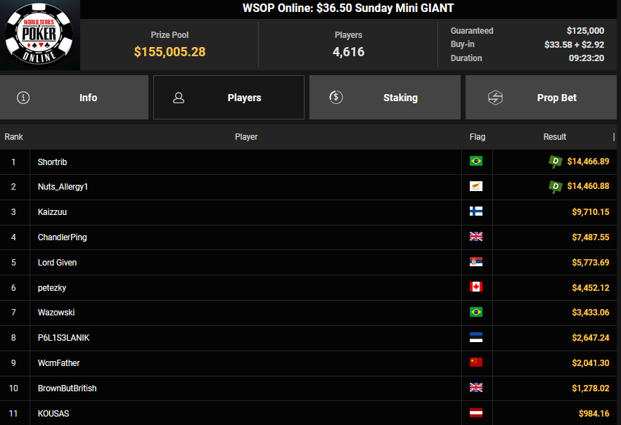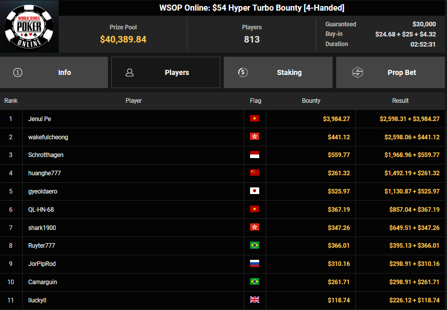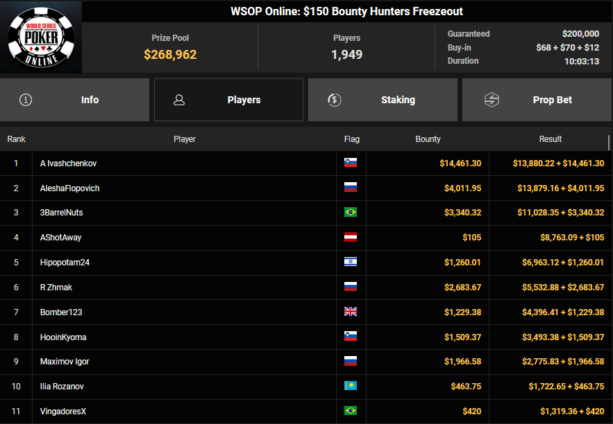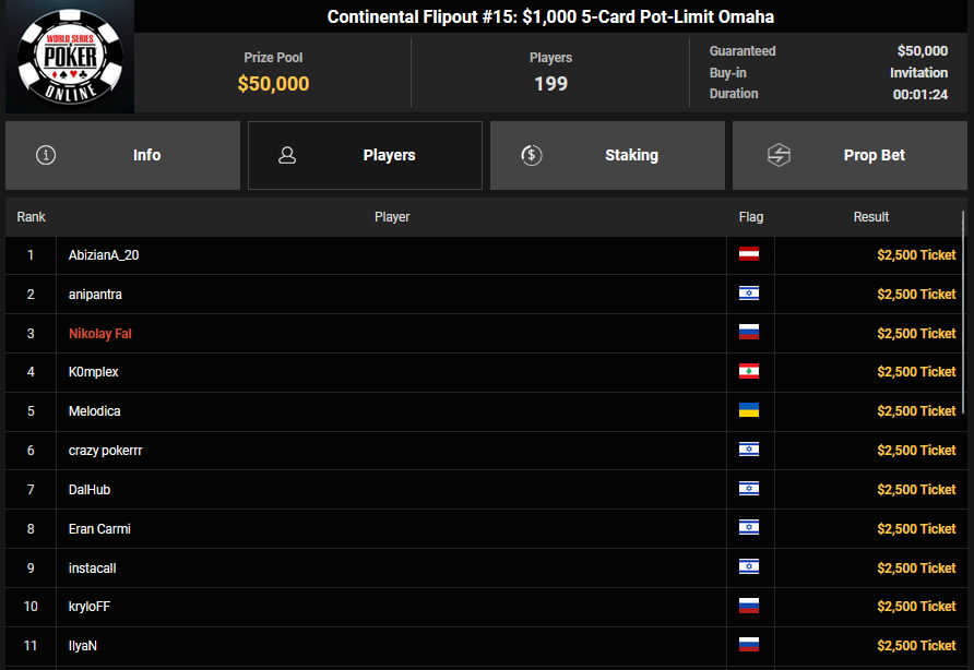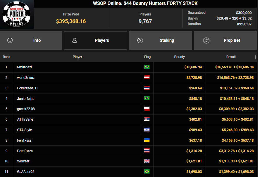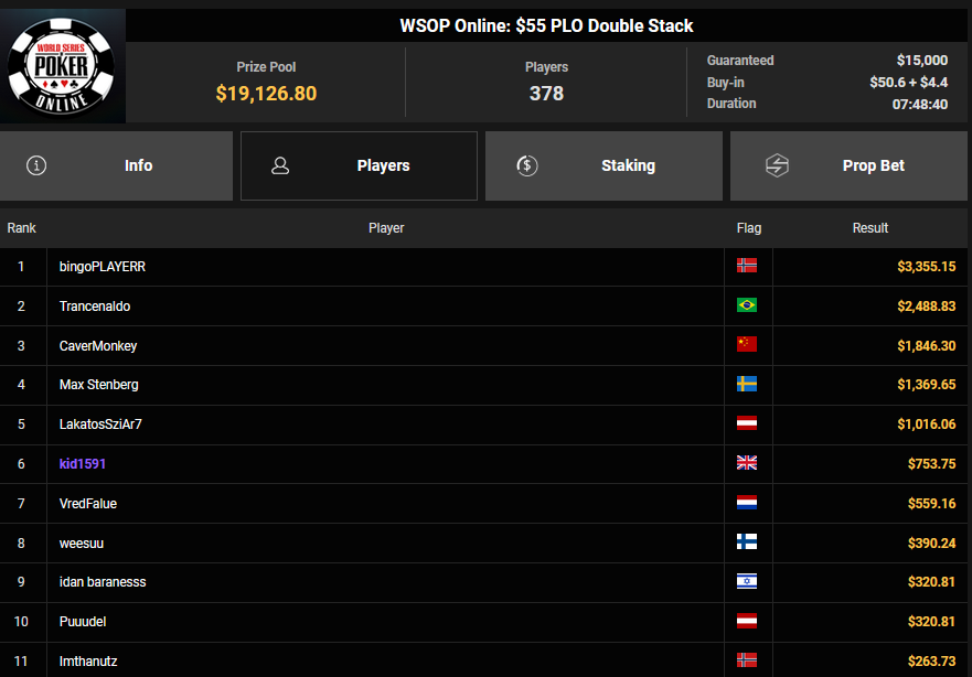Ein weiteres Bracelet geht nach Israel. Beim $1.000 5-Card PLO war es brix, der sich im Finale der letzten elf Spieler durchsetzen konnte und den Sieg für $110.015 + $30k WSOPP Super Pass holte. Davidi Kitai, der als Chipleader gestartet war, musste sich mit Rang 2 für $82.805 begnügen.