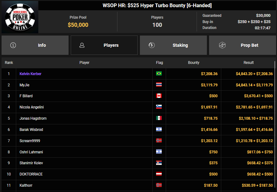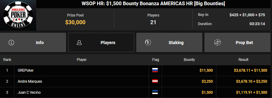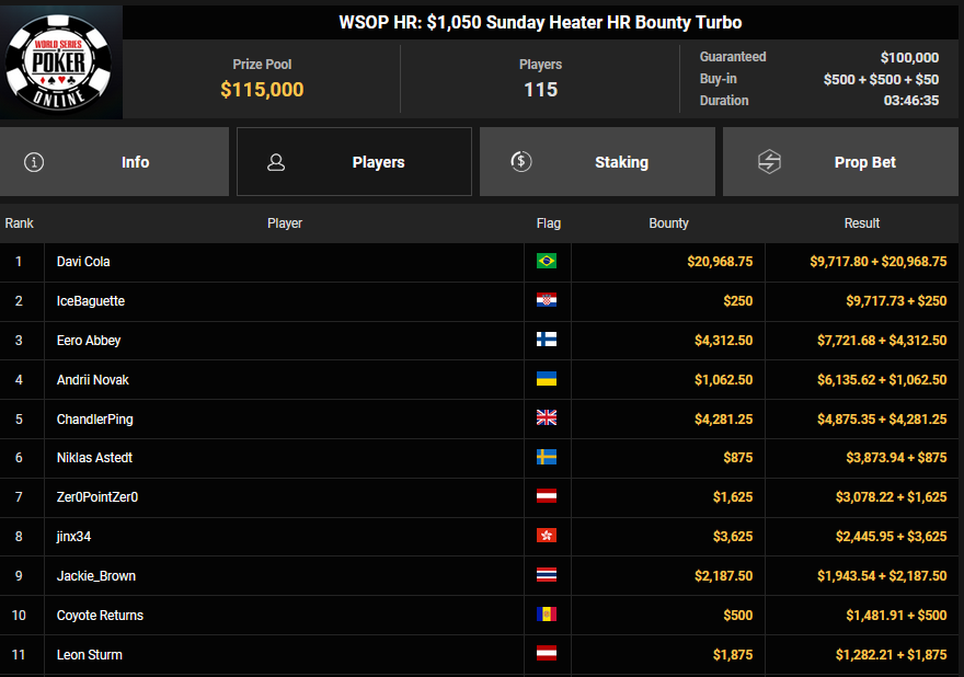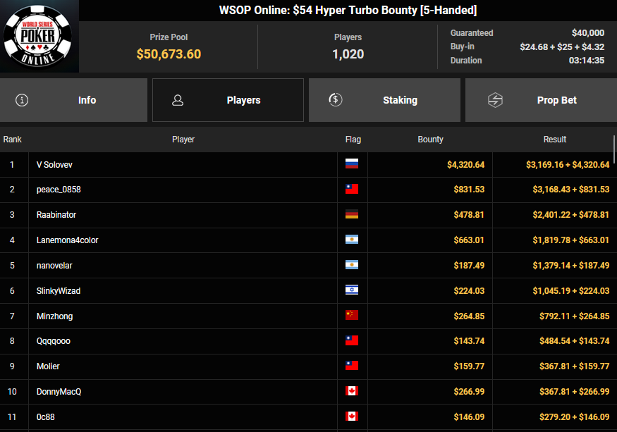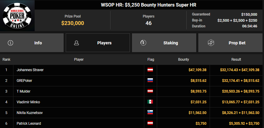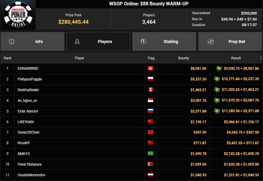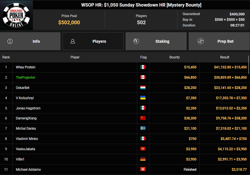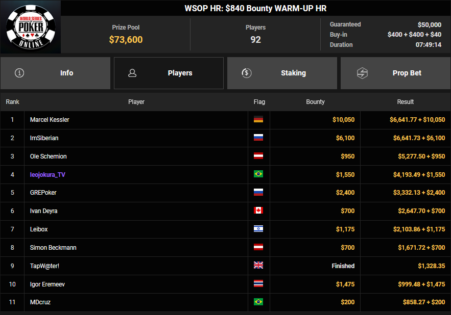 rearview7 holte den Sieg beim $525 Bounty Hunters HR Asia für $5.816 + $14.031, ProfaNic_v2 landete auf Rang 2 für $5.816 + $1.875. Marcel Kessler war schon früh beim $840 Bounty Warm-up HR für $6.641 + $10.050 erfolgreich. Ole Schemion kam hier auf Rang 3 für $6.641 + $6.100.