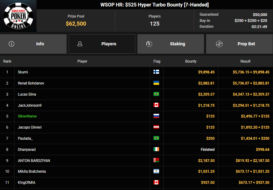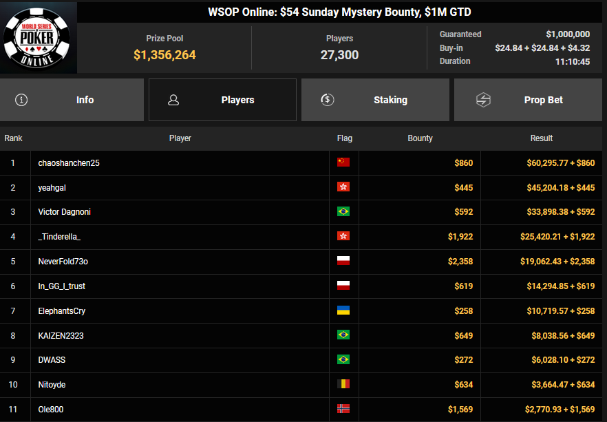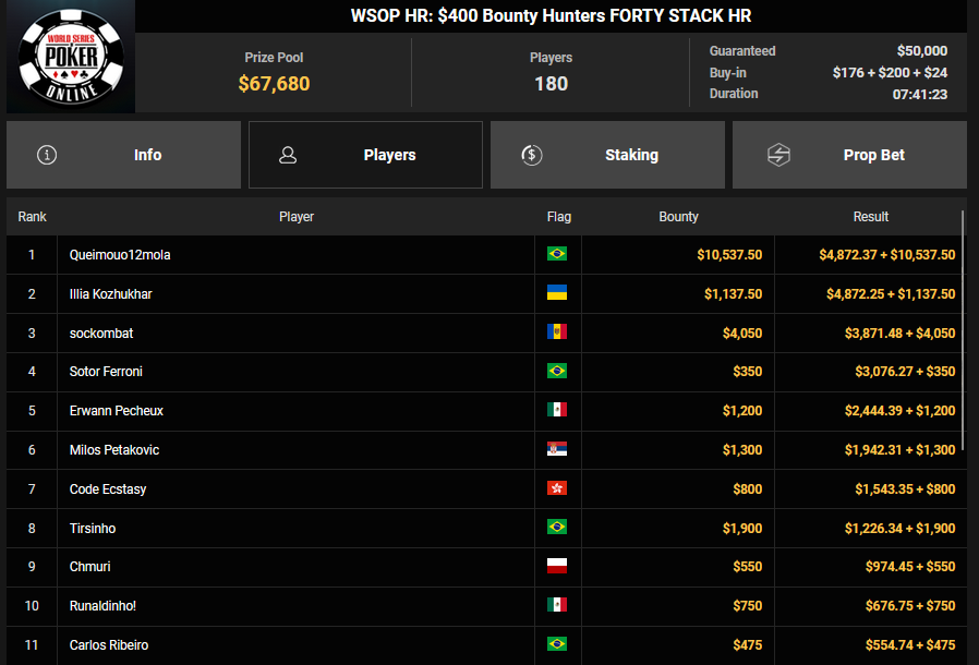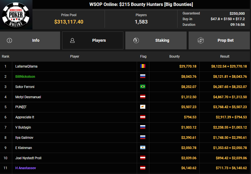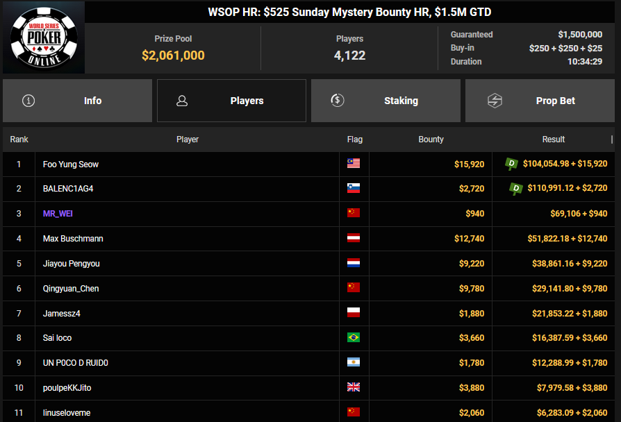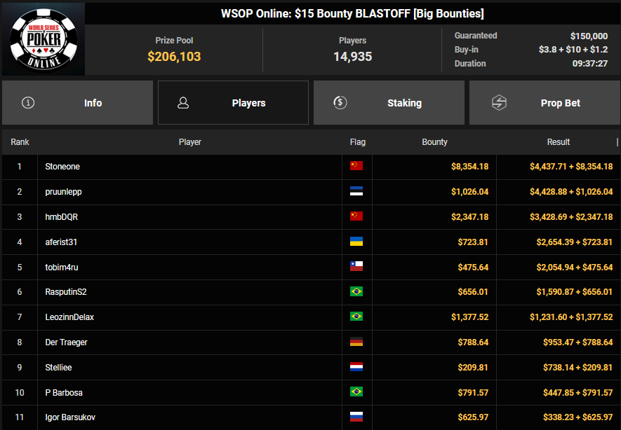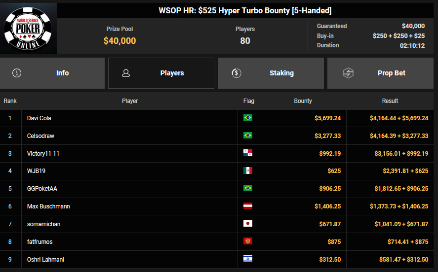 rearview7 holte den Sieg beim $525 Bounty Hunters HR Asia für $5.816 + $14.031, ProfaNic_v2 landete auf Rang 2 für $5.816 + $1.875. Marcel Kessler war schon früh beim $840 Bounty Warm-up HR für $6.641 + $10.050 erfolgreich. Ole Schemion kam hier auf Rang 3 für $6.641 + $6.100.