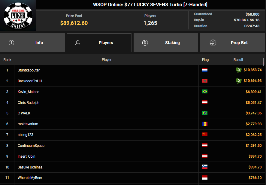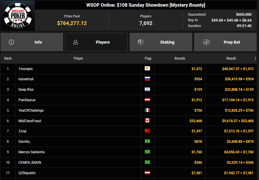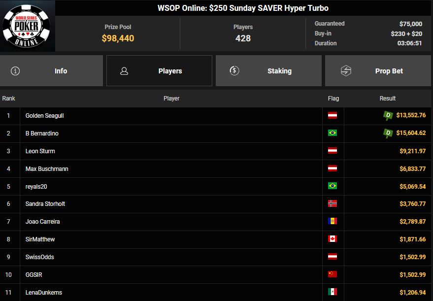 Tapier konnte Platz 3 beim $215 Sunday Heater ($4.122 + $1.489) erobern, für Christian Rudolph wurde es beim $77 Lucky Sevens nur Rang 4 ($5.051). Golden Seagull schnappte den Sieg beim $250 Sunday Saver ($13.552), Leon Sturm kam auf Rang 3 für $9.211 und Max Buschmann kassierte noch $6.833 für Rang 4. hazuzukaa wurde Runner-up beim $1.500 Sunday Saver für $15.016, Clickwork belegte Rang 3 für $12.154 und Chris Nguyen kassierte noch $9.837 für Rang 4. Beim $54 Hyper Turbo Bounty war es Raabinator, der Rang 3 für $2.401 + $478 mitnahm.