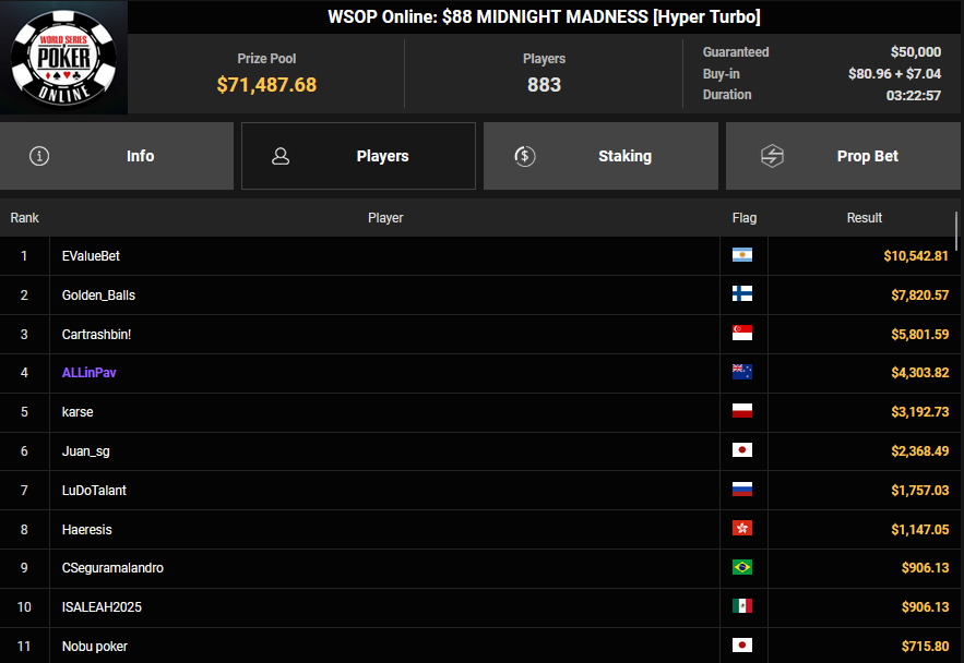 Beim $1.500 Millionaire Maker ist die $5.000.000 Garantie schon übertroffen, es gibt noch Flights. Auch die $400 Colossus ($4.000.000 GTD) und die $400 Plossus ($1.000.000 GTD) Flights laufen auf Hochtouren und ab heute wird die Schlagzahl beim $5k Main Event ($25.000.000 GTD) auch deutlich erhöht. Schaut auf jeden Fall immer auf die Satellites, um euch bankroll-schonend zu den Turniertickets zu spielen. Turniere & Satellites sind im Client im „WSOP“ Tab zu finden, alle Infos zu den Events gibt es auch auf den Seiten von GGPoker.