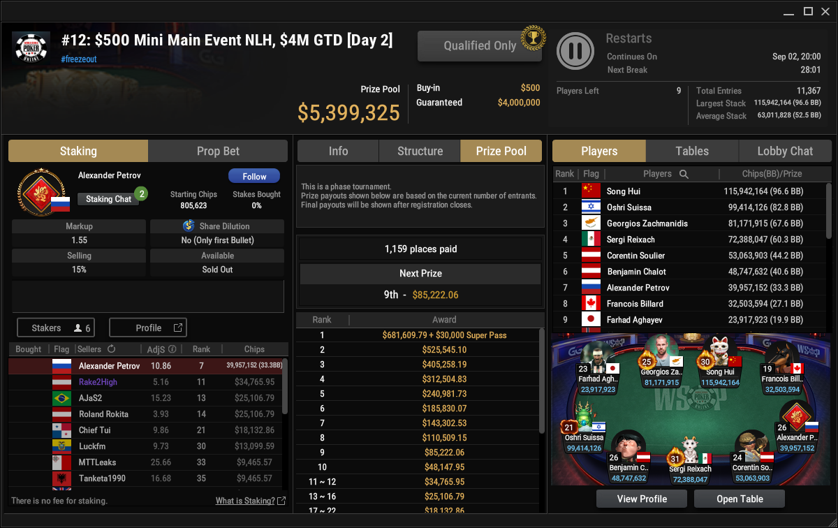 Locker kam man beim $500 Mini Main Event über die $4.000.000 Garantie. 11.367 Entries (8.851/2.516) sorgten für $5.399.325 Preisgeld, die top 1.159 Plätze waren bezahlt. Mit diesen 1.159 ging es auch in Tag 2, wobei kein deutschsprachiger Spieler am Ende übrig sein sollte. Corentin Soulier und Benjamin Chalot sind nur die österreichischen Fahnen am Final Table, an dem unter anderem auch Sergi Reixach Platz nimmt. Chipleader ist Song Hui, auf den Sieger warten $681.609 + $30k WSOPP Super Pass.