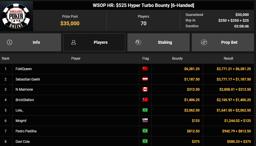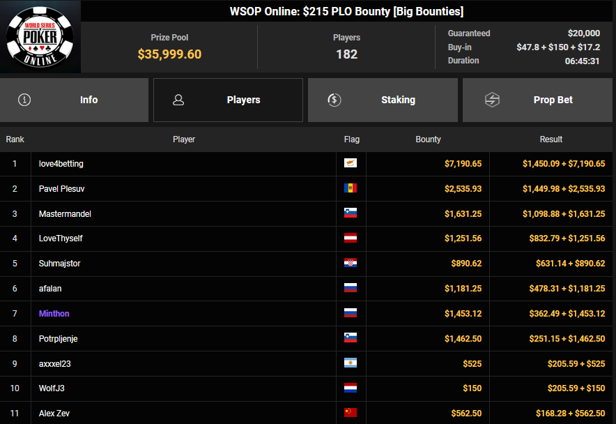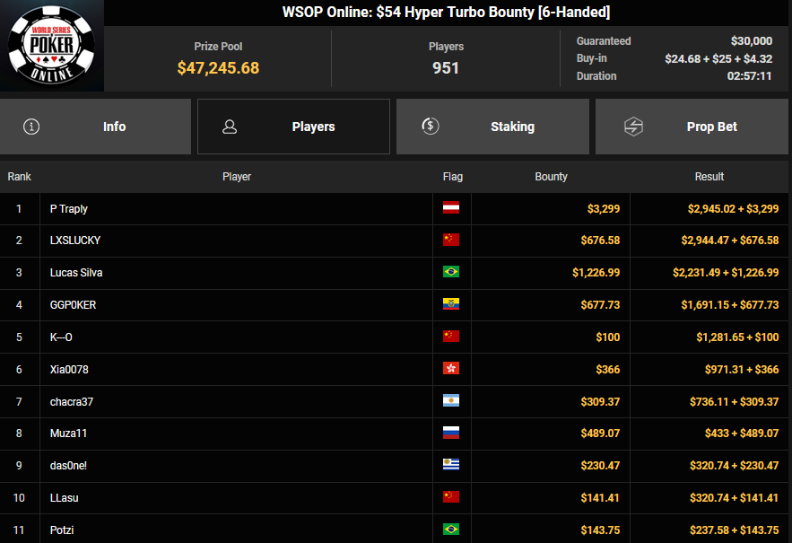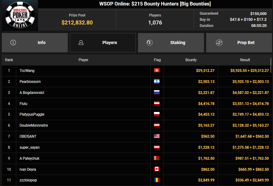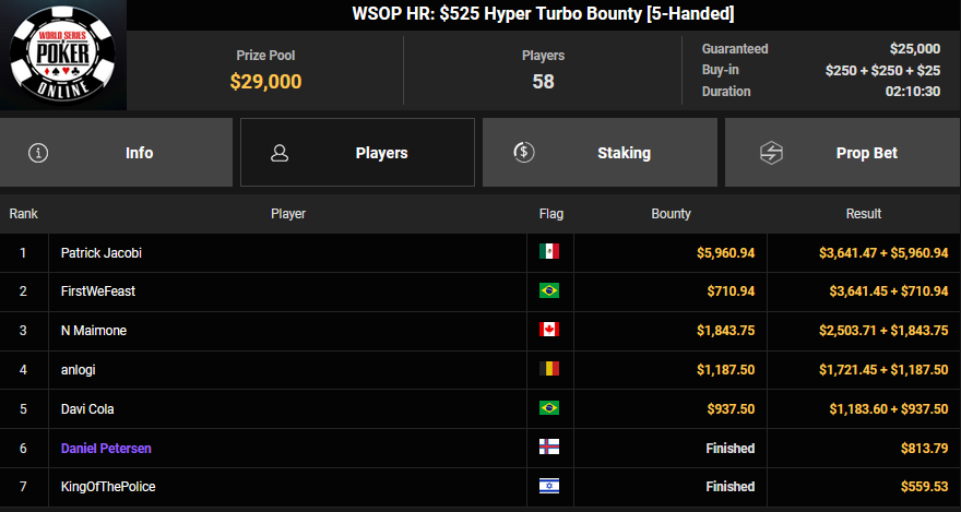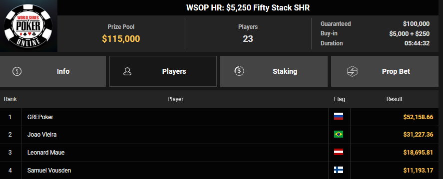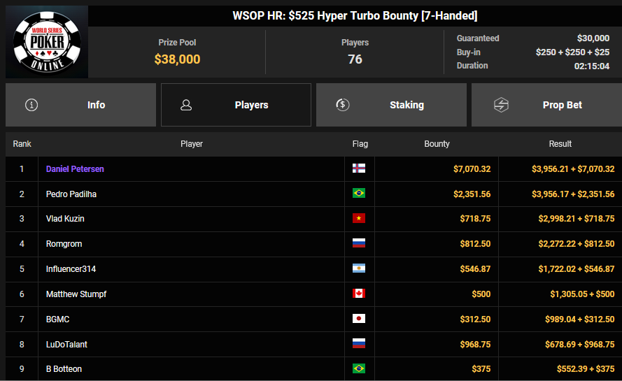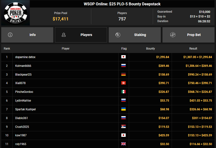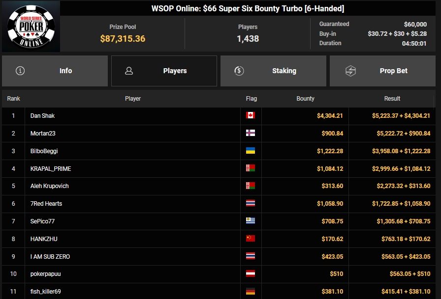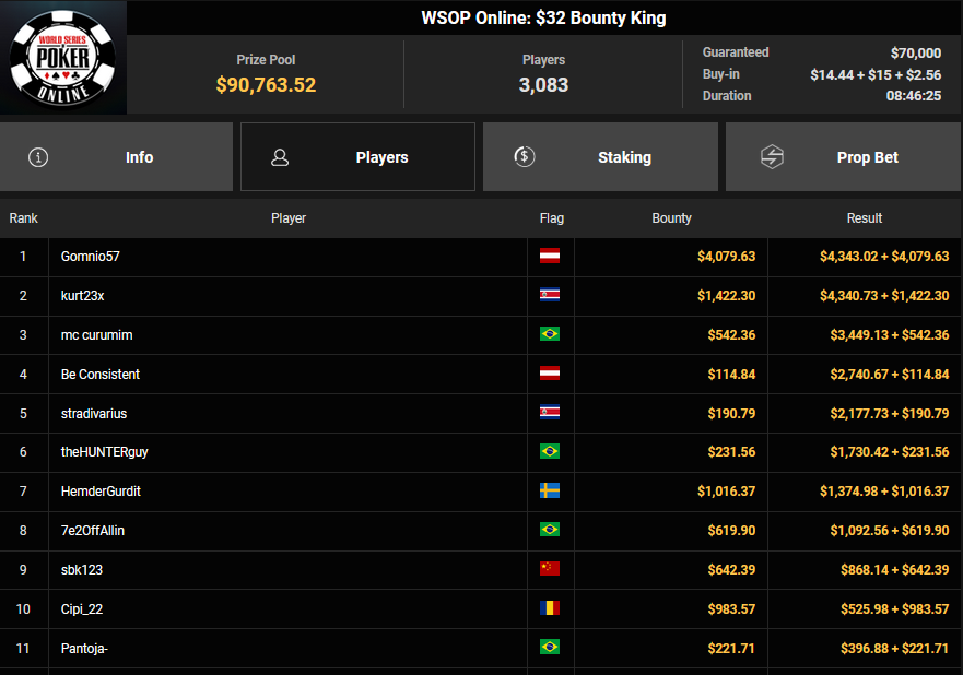 sperbinho1211 sicherte sich beim $55 Fifty Stack Platz 3 für $5.595, Leonard Maue holte beim $5.250 Fifty Stack SHR Platz 3 für $18.695. Gomnio57 setzte sich beim $32 Bounty King durch und kassierte $4.343 + 44.079. COverLOrd wurde beim $320 Bounty King HR Runner-up für $3.895 + $2.671, RichSpirit wurde ebenfalls Zweiter beim $$ Day Saver ($5.910).