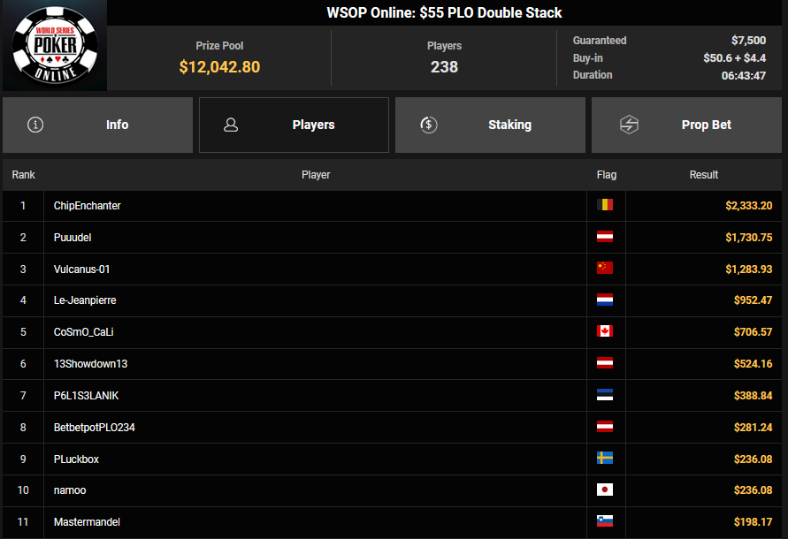 Nils „Puuudel“ Pudel wurde Runner-up für $1.730 beim $55 PLO Double Stack, AShotAway siegte beim $44 Forty Stack für $8.702 + $7.519.