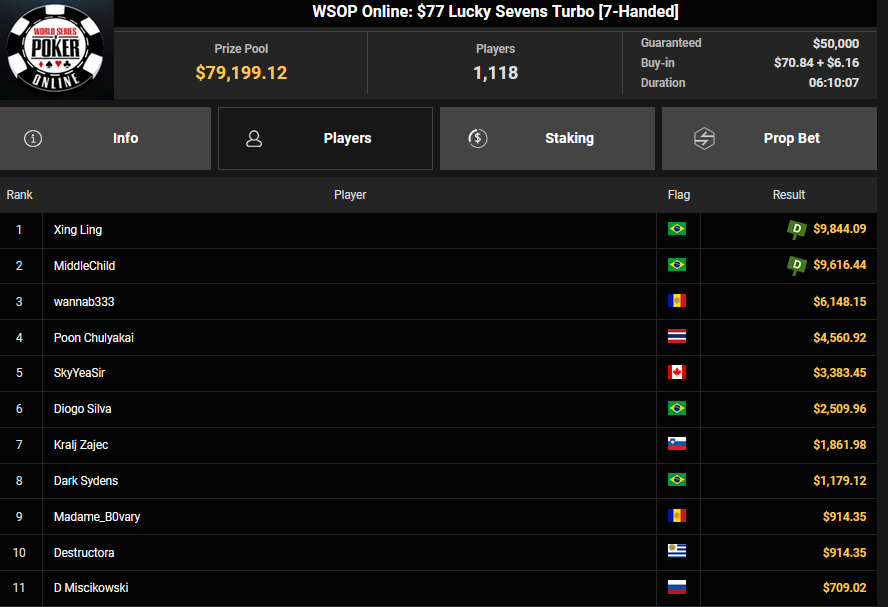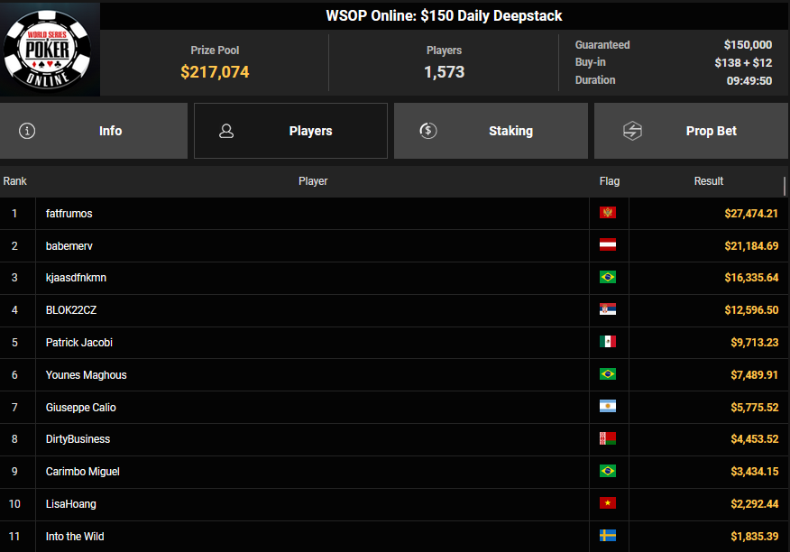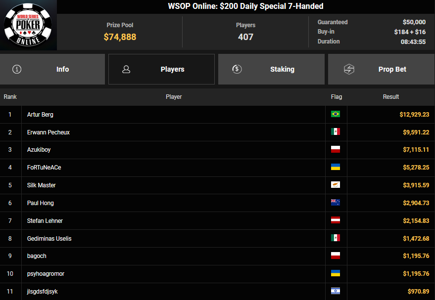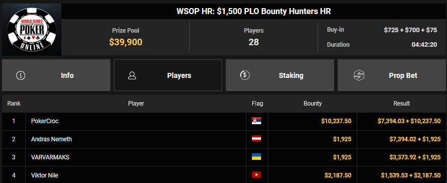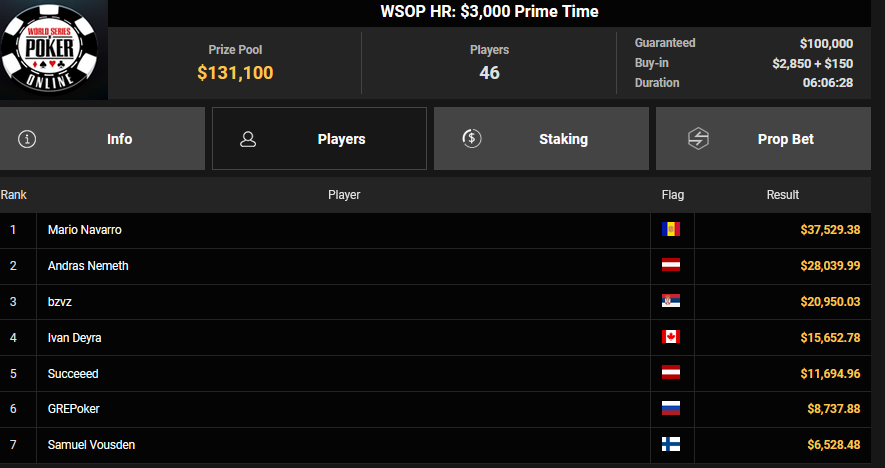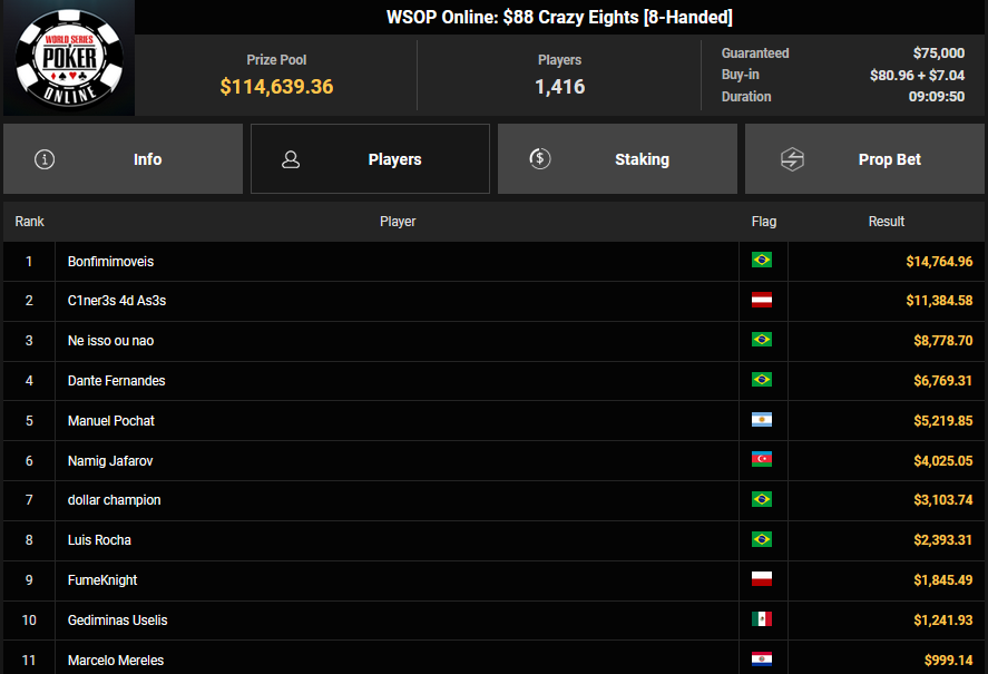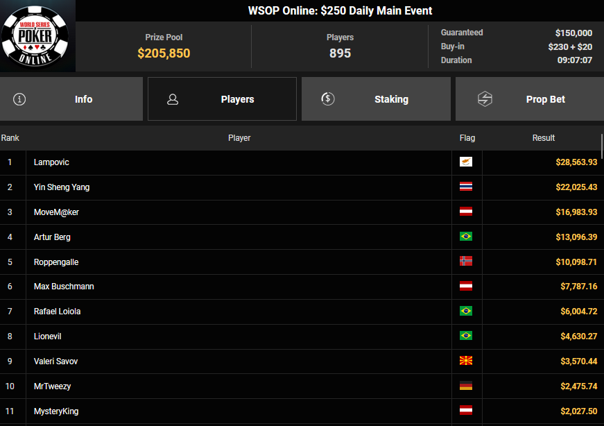 C1ner3s 4d As3s wurde Runner-up beim $88 Crazy Eights für $11.384, MoveM@ker belegte Rang 3 beim $250 Daily Main Event und kassierte $16.983. babemerv schrammte beim $150 Daily Deepstack am Sieg vorbei und nahm $21.184 für Platz 2 mit. Der Ungar Andras Nemeth holte das $1.500 Daily Deepstack HR vor MysteryKing, der $32.918 für Platz 2 kassierte.
