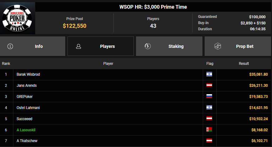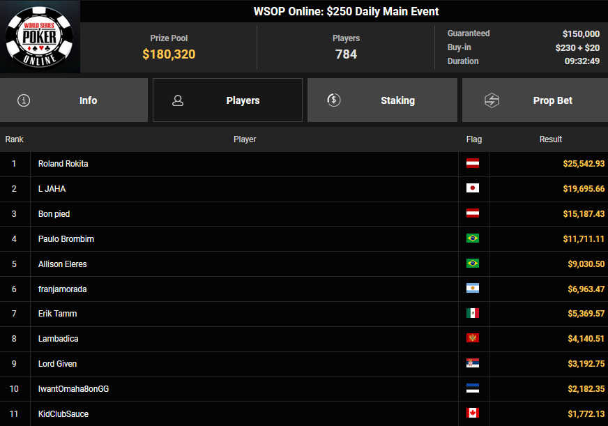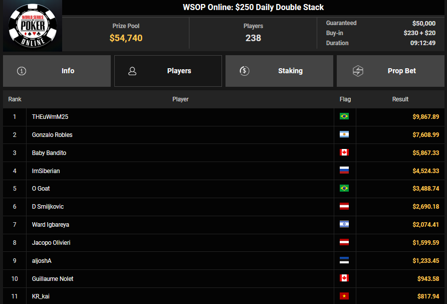 Die nächste Bracelet-Hoffnung gibt es aber schon beim $215 Mystery Millions. Es gab gestern noch einige (Flip)Flights und mit insgesamt 53.758 Entries waren es dann $10.633.332 im Pot. 4.548 Spieler nahmen Geld mit, acht können heute noch auf das Bracelet hoffen. Anika Hauch liegt als beste Deutsche auf Rang 4, Fabian Bernhauser als letzter Österreicher auf Rang 6. Alle haben $93.241 bereits sicher, der Sieger kann sich auf $576.251 + Bounties + $30k WSOPP Super Pass freuen.