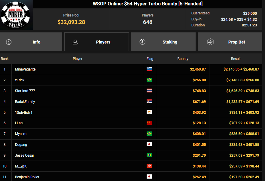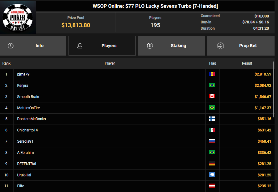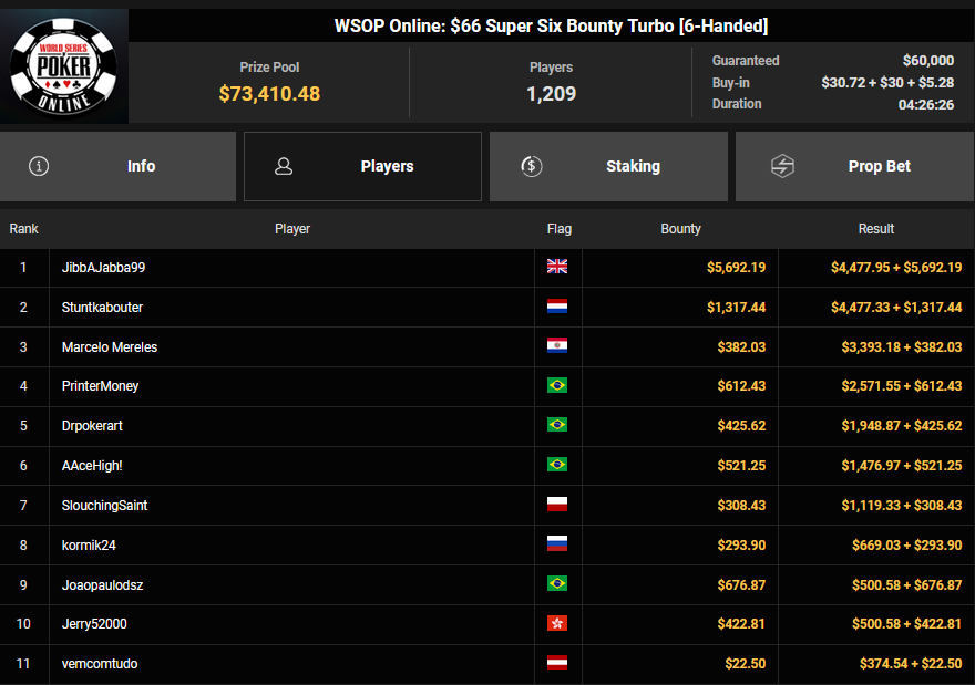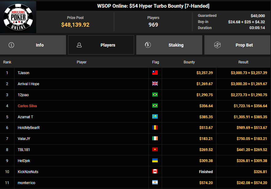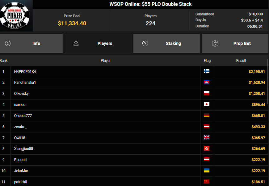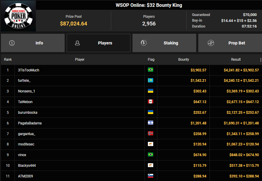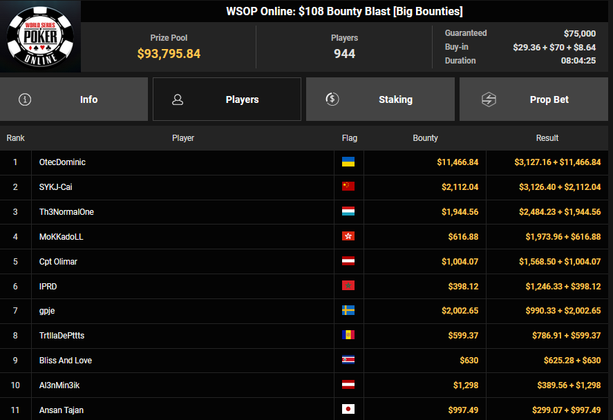 poker3styler holte Platz 2 für $1.270 + $2.999 beim $215 PLO Bounty, MysteryKing konnte Rang 3 beim $1.500 Daily Deepstack HR ($24.728) erobern. Philo0711 wurde Dritter für $2.685 + $792 beim $15 Bounty Hunters, auch Marco Sitter belegte beim $55 Fifty Stack Rang 3 für $5.424.