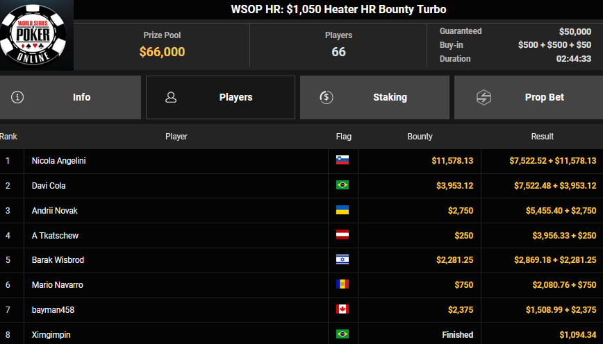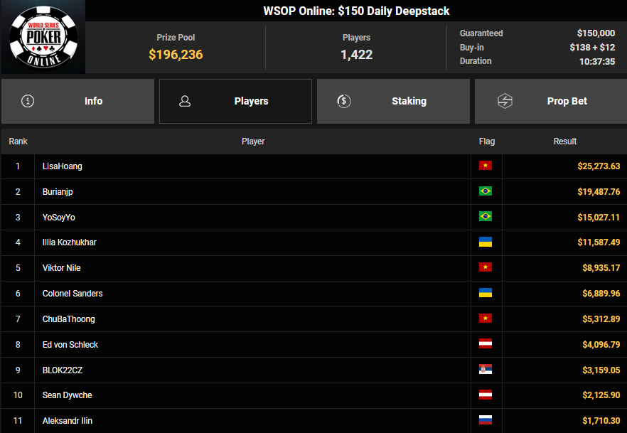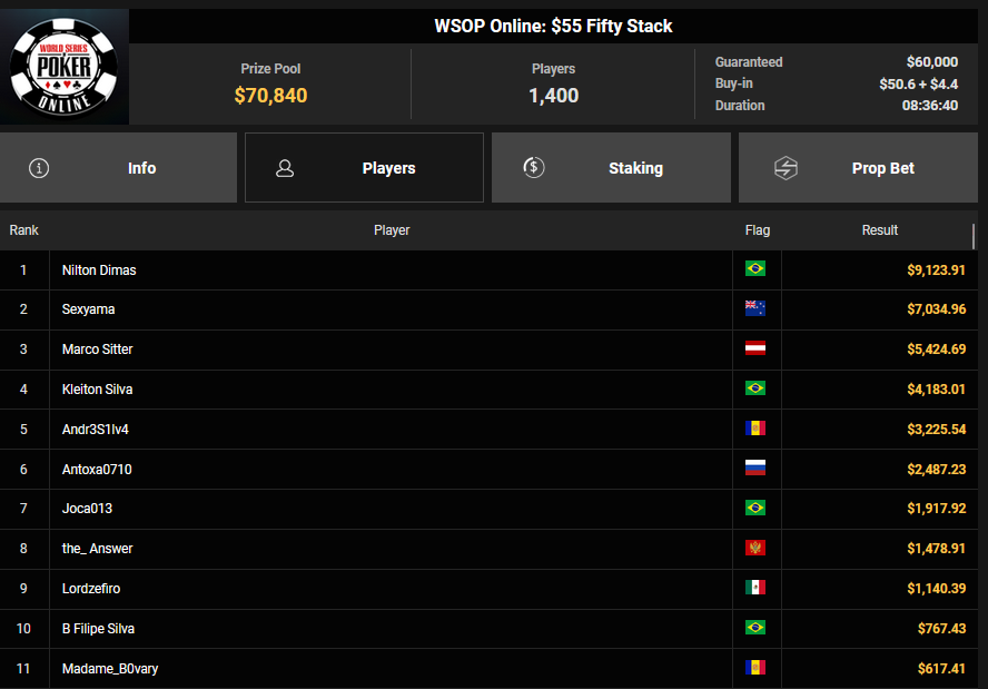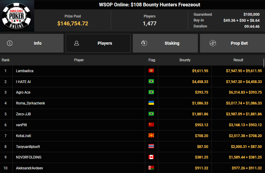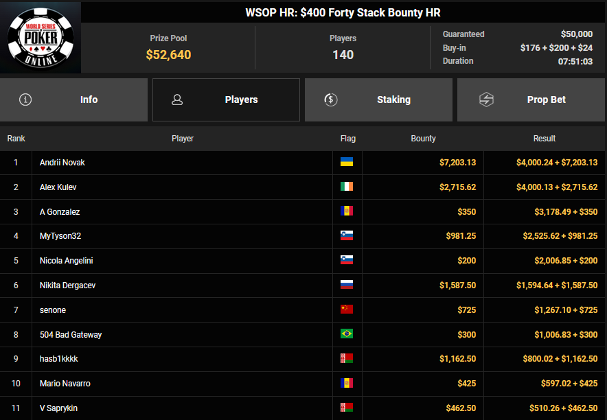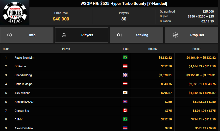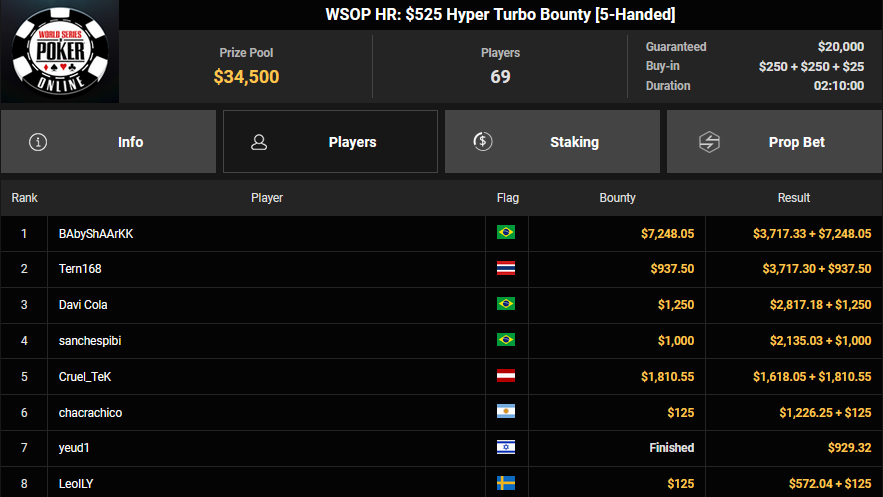 poker3styler holte Platz 2 für $1.270 + $2.999 beim $215 PLO Bounty, MysteryKing konnte Rang 3 beim $1.500 Daily Deepstack HR ($24.728) erobern. Philo0711 wurde Dritter für $2.685 + $792 beim $15 Bounty Hunters, auch Marco Sitter belegte beim $55 Fifty Stack Rang 3 für $5.424.