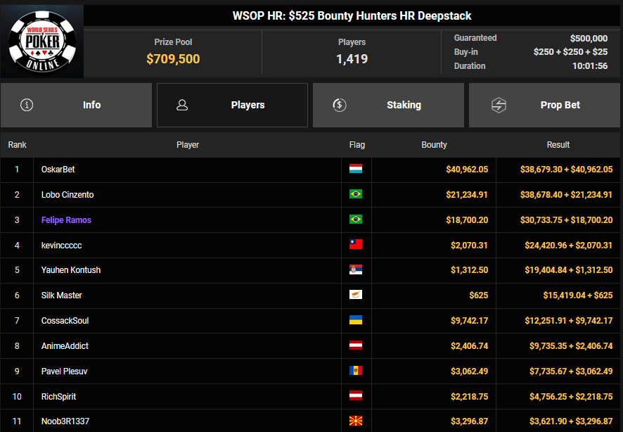Starke Zahlen lieferte wieder das $54 Bounty Hunters Daily Deepstack, bei 7.983 Entries wurde uuuuttttt Vierter für $10.762 + $4.405. Bei der %525Bounty Hunters HR Ausgabe waren es ebenso starke 1.419 Entries, der Luxemburger OskarBet holte den Sieg für $38.679 + $40.962. Felipe Ramos kam auf Rang 3 für $30.733 + $18.700.
