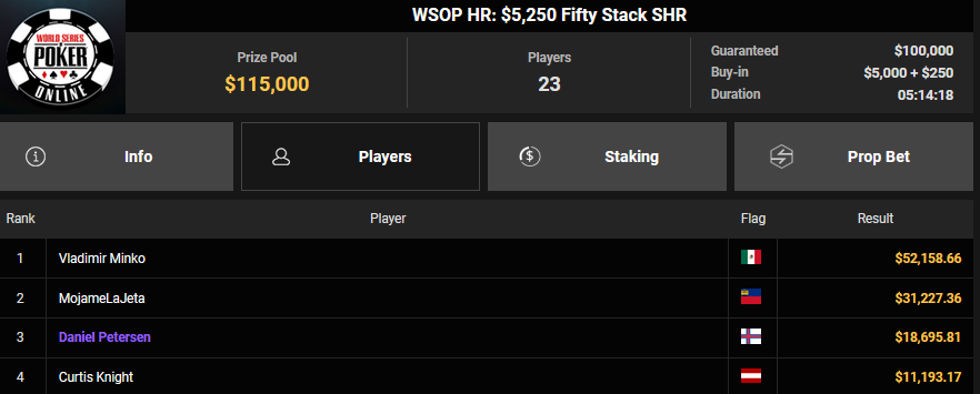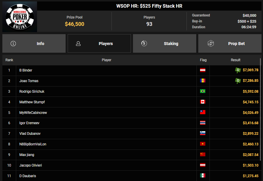 Bernhard Binder teilte beim $525 Fifty Stack HR und holte $7.069 für den Sieg, MojameLaJeta wurde beim $5.250 Fifty Stack SHR Runner-up für $31.227.