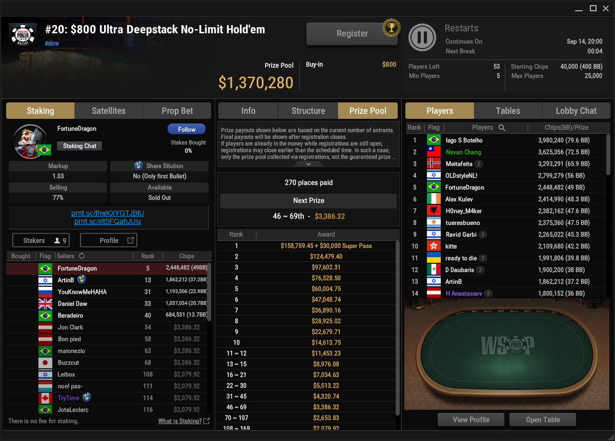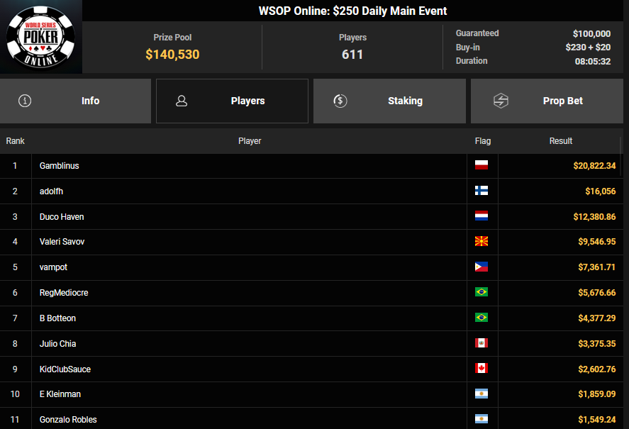 Auch heute laufen wieder Flights beim $400 Colossus ($4.000.000 GTD) und beim $400 Plossus ($1.000.000 GTD), natürlich kann mach sich auch beim $5k Main Event ($25.000.000 GTD) qualifizieren. Außerdem wird auch das $1.500 WSOP GGMasters HR Freezeout gespielt. Schaut auf jeden Fall immer auf die Satellites, um euch bankroll-schonend zu den Turniertickets zu spielen. Turniere & Satellites sind im Client im „WSOP“ Tab zu finden, alle Infos zu den Events gibt es auch auf den Seiten von GGPoker.