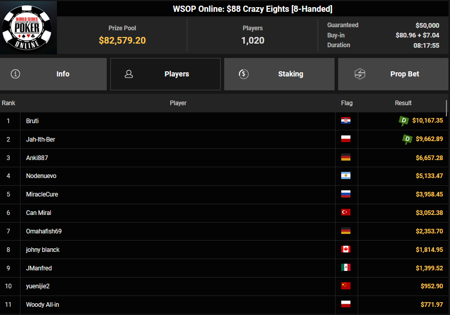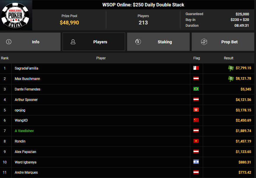 Max Buschmann startete mit einem zweiten Platz, aber dank eines Deals dem meisten Geld beim $250 Daily Double Stack ($8.121), KingKvn siegte beim $88 Bounty Classic für $5.541 + $4.272- TurboFalconX sicherte sich den Sieg beim $44 Forty Stack Bounty für $8.375 + $7.034, Anki887 eroberte beim $88 Crazy Eights Rang 3 für $6.657.