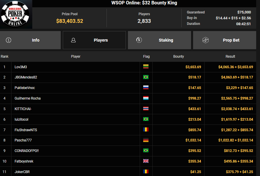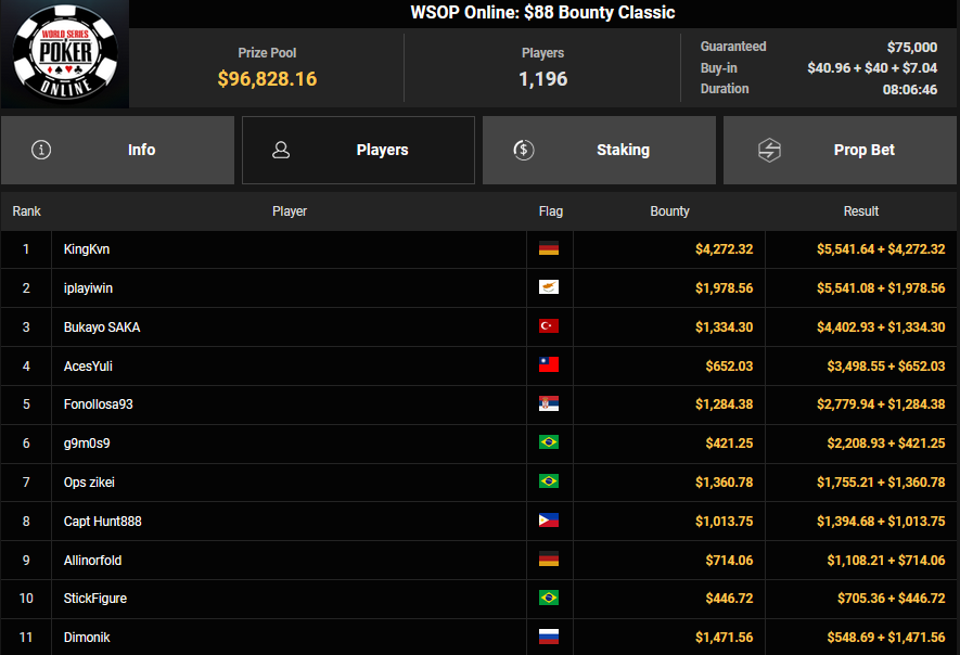 EagleAye wurde beim $320 Bounty King HR Runner-up für $2.530 + $825, während Syllwek505 ($1.943) und SwissOdds ($1.441) beim $77 PLO Lucky Sevens einen Doppelsieg feierten.