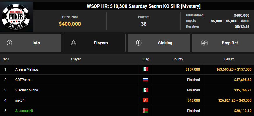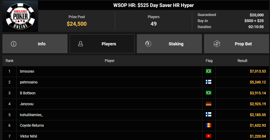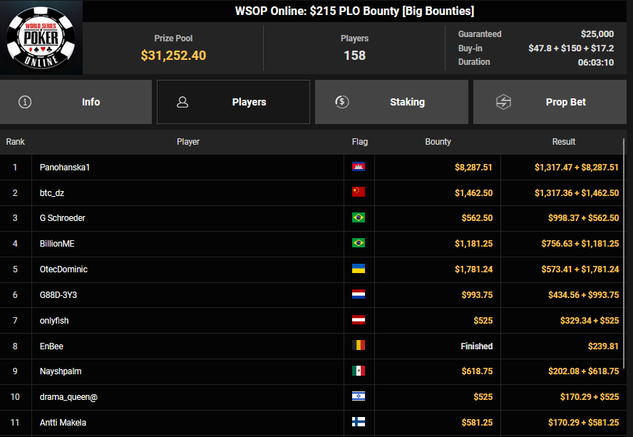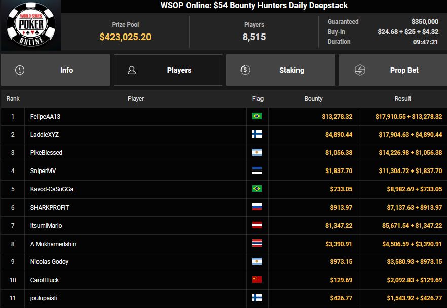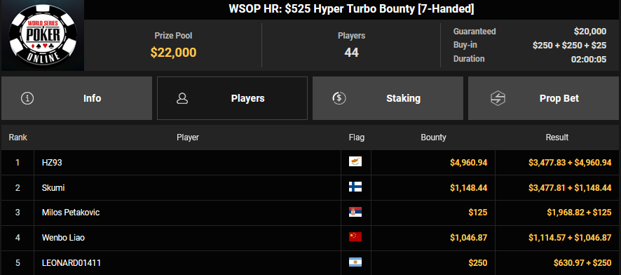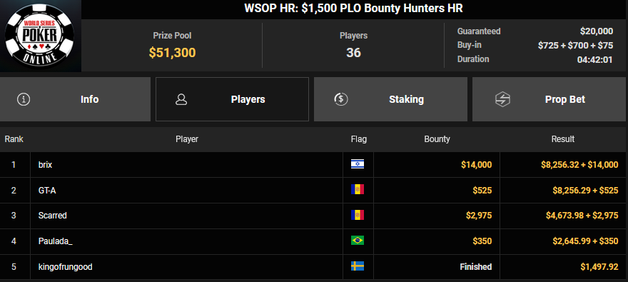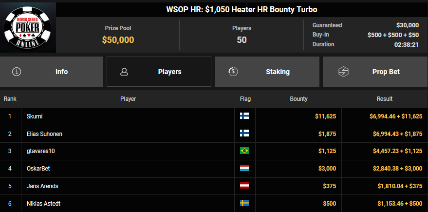 Christian Rudolph belegte beim $525 Bounty Hunters HR Rang 3 für $28.851 + $9.414, accio-chips konnte Rang 4 für $22.925 + $9.673 erobern. Für accio-chips gab es dann auch $32.590 + $54.950 für Rang 2 beim $1.500 Saturday Secret Bounty. OskarBet kam hier auf Rang 4 für $18.327 + $2.400, Ole Schemion nahm Rang 5 für $13.743 + $12.700 mit.